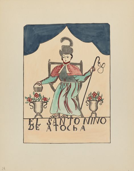 Editor: This is E. Boyd's "Retablo-Child's Saint," dating from between 1935 and 1942, created with watercolor and drawing techniques. There’s a real simplicity to it, almost like a page from a children’s book, but with a formality, too. What strikes you most about it? Curator: What I see here is more than just a simple religious image; it's a fascinating intersection of folk art traditions and complex cultural narratives. Look at the way "El Santo Nino de Atocha," a specific representation of the Christ Child, is depicted. Notice the fine clothes and hat – it is as if the artist wants to highlight their cultural sophistication in tandem with spirituality. Editor: I didn’t pick up on that tension at first. Curator: Boyd wasn't merely replicating religious iconography, but documenting its evolution within specific communities. These retablos often served as powerful forms of expression for marginalized voices, a way to narrate their experiences and negotiate their identities within the dominant culture. Who were the subjects? What messages were sent by these visual strategies? Editor: So it's not just about faith; it’s about identity and resistance? Curator: Precisely. The Child Saint figure, while seemingly passive, embodies a long history of cultural syncretism and adaptation. By understanding the social context in which these retablos were created, we can unpack their layers of meaning and appreciate their significance as acts of cultural preservation and defiance. Editor: I see it so differently now, recognizing this blend of devotion and cultural assertion. It makes the image so much more powerful. Curator: Yes. Thinking critically, this artwork goes beyond simplistic depiction. Understanding the world this was made in adds another vital element in thinking about the cultural meaning of visual representation.