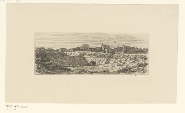 Editor: Here we have "Duinlandschap bij Haarlem," a landscape etching created by Carel Nicolaas Storm van 's-Gravesande in 1878. There’s a quiet, almost melancholic mood to it, mostly created by the subdued grayscale palette and the vast expanse of the sky. What formal qualities strike you most about this piece? Curator: The atmospheric perspective achieved through etching is particularly compelling. Notice how the artist employs delicate lines and varying degrees of tonal depth to simulate the recession of space. The foreground is rendered with comparatively dense, assertive strokes, which gradually attenuate as the eye moves towards the horizon, subtly creating depth and volume. Editor: So it’s the meticulous use of line that builds the structure and defines space? Curator: Precisely. Note too, how the composition is structured around the contrasting textures: the tactile quality of the dunes against the ephemeral nature of the cloudscape. Consider also how the diminutive human figure is placed, an element contributing to a proportional imbalance—highlighting, perhaps, humanity's relationship to the landscape itself. Does that reading resonate with you? Editor: It does. It makes me see how the artist uses these basic formal tools – line, tone, and composition – to create a structured but emotional response. Thank you for showing how this close attention to form can enrich our experience. Curator: My pleasure. Sometimes, it’s precisely by attending to those elements that the broader effects take on enhanced significance, enabling a deeper, informed experience of art.