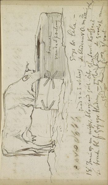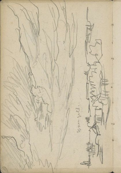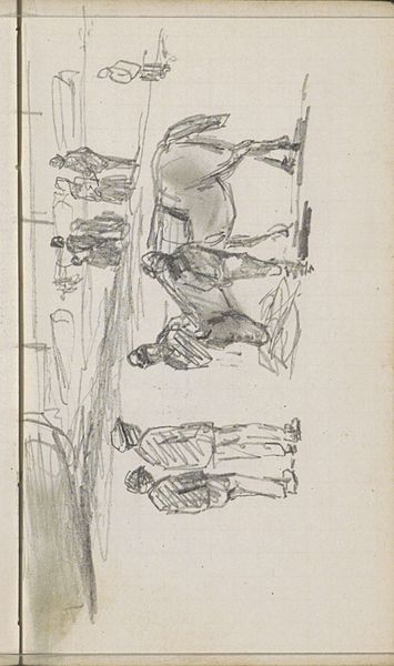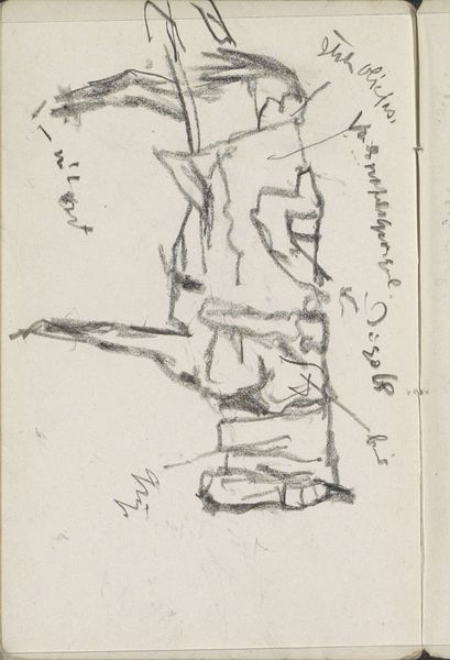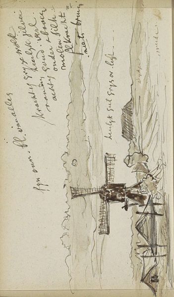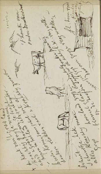 This is a pen drawing titled "Weiland met mannen die hooi maaien," by Johannes Tavenraat. The overall visual effect of the drawing lies in its energetic composition and its use of dynamic lines. The scene depicts a group of men engaged in haymaking, each rendered with swift, economical strokes. The composition itself is structured around a series of diagonal lines, which create a sense of movement and activity across the field. Note how Tavenraat’s rapid marks capture the essence of labor and rhythm. These lines do more than just define shapes, they function almost as vectors, directing the viewer’s eye and conveying the physical exertion involved in the act of haymaking. The artist's marks are open and gestural. Here, the materiality of the line underscores the transient nature of labor and the landscape. This emphasis on line and form over detail invites a reading that values the process of representation, capturing not just what is seen, but how it is experienced.