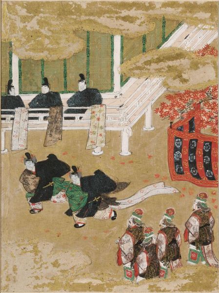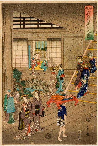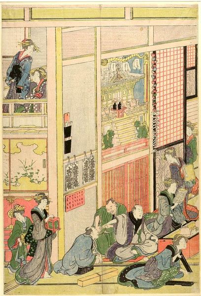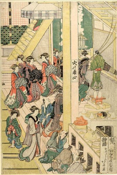Editor: This is Hokusai's "Interior of a Yoshiwara Tea House." There's so much going on! The composition is very dynamic, almost like a snapshot. What can you tell me about this work? Curator: Hokusai provides a glimpse into a world of women, artifice, and commerce. How does this image challenge or reinforce the existing power structures of the time? Consider the male gaze and the agency of these women. Editor: I see what you mean! So, it's a lot more than just a pretty picture of a tea house. Curator: Exactly. It's an intersection of class, gender, and artistic representation. I wonder how contemporary viewers see parallels in media portrayals of women today?