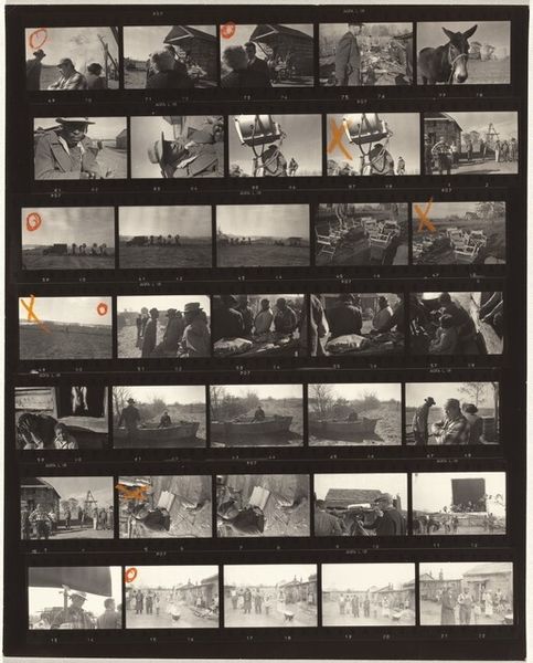 Robert Frank captured these images in Tennessee, documenting the filming of Elia Kazan's "Wild River." This contact sheet presents a series of moments, dominated by the presence of TVA vehicles. The TVA, or Tennessee Valley Authority, looms as a powerful symbol. It signified progress and modernization, yet here, it also evokes the disruption of traditional ways of life. We see the machinery of progress juxtaposed with the rustic, almost biblical scenes of rural existence. The cars repeat across the frame, becoming a kind of oppressive motif, like the march of time itself. Consider how the symbol of a vehicle, once a chariot of the gods, then a signifier of wealth and progress, has now come to represent something more ambivalent. In these images, they evoke the anxiety of change and the tension between the old and the new. The photograph taps into a collective memory of displacement and transformation, engaging us on a subconscious level with the complex narrative of progress and its discontents. The motifs resurface, evolving, and taking on new meanings with each historical context.
