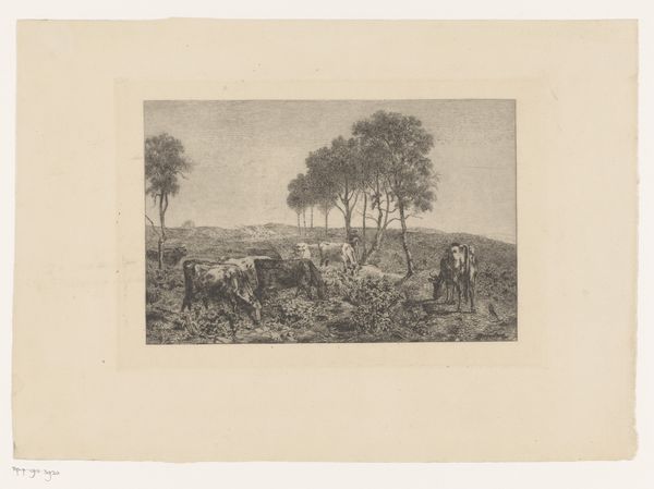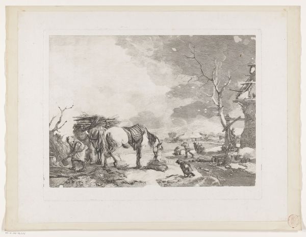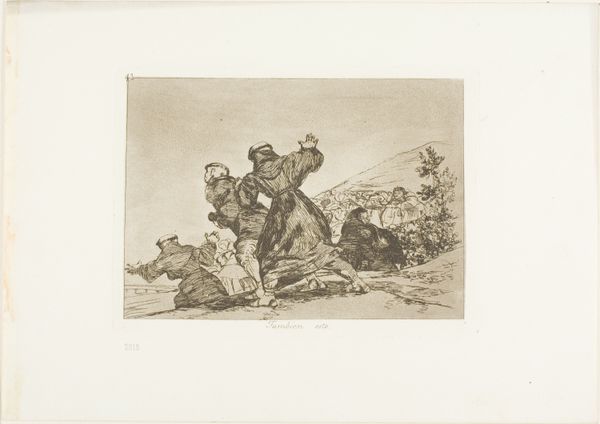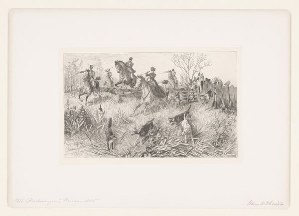 Curator: What a wonderfully energetic image! All that swirling line work… it practically vibrates off the page. Editor: Indeed. What you're experiencing is Giovanni Fattori's etching "The Cavalry Charge," created in 1889. It resides here at the Art Institute of Chicago. Looking at the physical materials gives us an insight into its creation; an etching made using paper, likely available at the time, speaks to broader production contexts. Curator: Production? I am immediately drawn to the deployment of lines, the frenzied hatching giving form to charging horses and riders. It’s a whirlwind, almost indiscernible chaos contained within the borders of the image. Notice how the density of the marks increases toward the center, emphasizing the heart of the action. Editor: Right, and we can link that chaos to a period in Italian history of immense upheaval. Fattori, a prominent member of the Macchiaioli group, captured the social realities, not merely aesthetics. We cannot overlook that it may depict battles that redefined power structures. His choice of printmaking also democratized art production. Curator: Yes, but look again. The formal elements tell a story. Observe how light is treated, barely suggested with sparse lines towards the upper portion and how the overall lack of distinct forms in the background adds to the disorienting impact of war. The viewer has to construct much from mere suggestion; he’s not detailing propaganda or glorification; instead he shares lived, tumultuous reality, rendered dynamically by lines and shades. Editor: Lived reality indeed, influenced by the resources at hand and choices inherent in that moment of labor. Availability dictated Fattori's etching practices: metal plates, acid baths... It speaks volumes about Italy's industrial ability and international exchanges within the creative ecosystem. Curator: Perhaps. For me it evokes timeless visual elements—dynamic diagonals and skillful balancing act between order and mayhem that speaks loudly. These are design elements which contribute primarily to the emotional depth within “Cavalry Charge”. Editor: That is insightful, if a tad too removed from practical forces fueling it all, the economics allowing creation of that plate. A full appreciation blends material and emotion… Curator: Well said, truly blending both of our appreciation yields new layers to this etching's complex beauty. Editor: Indeed. It leaves you reflecting deeper, understanding process influences on aesthetics beyond simple observation.