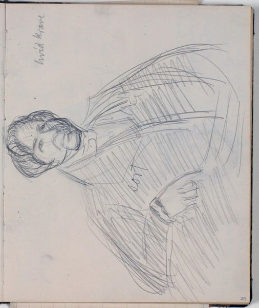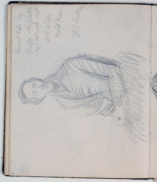 Curator: Looking at Niels Larsen Stevns' "Studie af Thorvaldsen efter maleri af C. A. Jensen. Farveangivelser," created sometime between 1930 and 1936, one immediately notices the tentative, almost ghost-like quality of the image. Editor: Yes, there's an ethereal, dreamlike state suggested by the delicate pencil lines. It looks like a fleeting memory captured on paper. Curator: This drawing provides us with a valuable insight into the artistic process. It's clearly a study, a preparatory work of sorts, exploring the representation of Bertel Thorvaldsen through Jensen's painting, rather than a finished piece. Consider how Stevns uses the very act of sketching as a mode of inquiry. Editor: And note the "Farveangivelser" – color indications. These notations suggest the materiality and even commerce surrounding painting. Who knew sketches would later enter prestigious museums? Curator: Indeed, these inscriptions give a crucial insight into art production. We see here the material constraints and the labor inherent in translating the color palette for potential future artwork by the artist. This emphasizes drawing not merely as aesthetic practice but a tool within an economy of image making. Editor: The layering effect adds another dimension; it evokes a sense of time passing, perhaps hinting at both Thorvaldsen’s enduring legacy and Stevns' interpretation across years. Curator: Exactly. Furthermore, consider the role that museums such as the SMK play. They safeguard these preparatory studies, bringing them into the public realm. A sketchbook page like this raises questions: what gives such works value, and whose stories get told? Editor: It prompts us to consider how artistic lineage is constructed, too. Here we have Stevns interpreting Jensen who interpreted Thorvaldsen. Curator: In the end, it offers a rare glimpse into the thought process of the artist and how influences shape a practice and also what materials become part of museums today, beyond 'finished' canvases. Editor: Precisely. This unassuming sketch, full of ghost lines, invites us to meditate not only on art, but how its entire system of production functions.