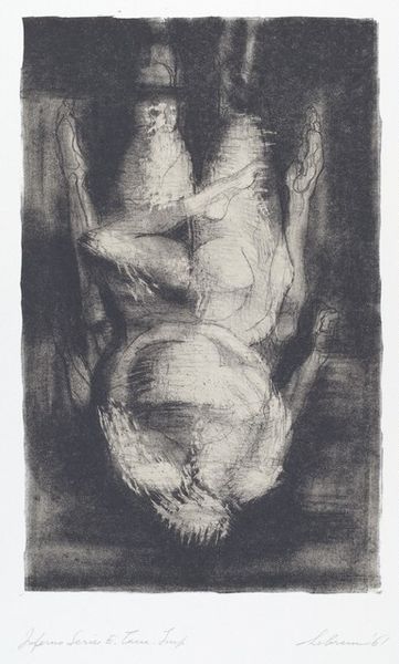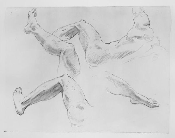 Curator: Dame Elisabeth Frink created "Spinning Man V." Look at the raw, almost frantic quality of the marks. What's your initial impression? Editor: It's incredibly visceral. The energy practically vibrates off the page, a sort of frenzied dance, or perhaps a struggle? Curator: Considering Frink's practice, her sculptures often explored themes of masculinity and power. This work, rendered in sparse, almost brutal strokes, reflects those themes on paper. The way she's manipulated the charcoal— Editor: Absolutely. Notice how the frantic, repetitive strokes build form. The density of the lines creates a sense of movement, while the negative space around the figure enhances the feeling of isolation. Curator: The paper itself becomes a stage for the interplay of force and vulnerability. It's a fascinating insight into Frink's wider concerns with human nature and its capacity for both violence and grace. Editor: Indeed, and it leaves you contemplating the conditions—both material and social—that give rise to such raw expression.