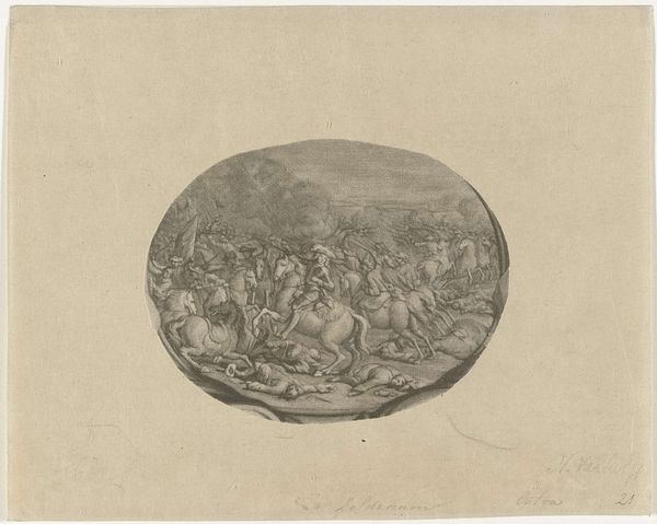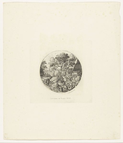 Editor: This is "The Judgement of Midas," an etching and engraving by Johann Wilhelm Baur, made around 1631-1632. I'm really struck by how delicate it is, like a scene captured in a snow globe. What story do you see unfolding within this tiny, etched world? Curator: Ah, yes, the "Judgement of Midas!" Baur's got a playful touch, doesn’t he? See how Apollo's radiating light like a rock star, demanding attention, while the figures huddle around like gossiping theatergoers? It’s based on a classical myth - Midas, that greedy king, gets to judge a music contest between Apollo and Pan. What a ridiculous setup. What do you think Baur is implying about the act of judging or, dare I say, art criticism itself? Editor: I guess it seems a bit…satirical? Like, everyone's vying for attention, but is there any real substance to their opinions? The composition is so theatrical. Curator: Precisely! And it's Baroque, so excess is expected! The tight composition creates a sense of claustrophobia, almost like everyone’s trapped within Midas’s terrible taste. I also wonder about Baur using etching for this. It allows for fine detail, but also a kind of nervous energy, fitting for a scene of such dubious judgment, wouldn’t you say? Editor: Absolutely. I didn't even consider how the medium itself adds to the overall feeling. So much is packed into a relatively small print. I'll never look at etchings the same way again. Curator: And remember, art isn't about knowing; it's about feeling your way through the unknown, laughing a little, and maybe even changing your mind along the way. Like Midas… hopefully we'll have better luck with our own choices.