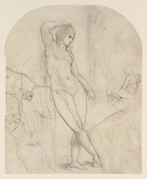 Curator: Here we have Wilhelm Lehmbruck’s etching "Woman and Child", created in 1914. The mood is surprisingly tender. The delicacy of the etched lines almost softens the forms. Editor: Surprisingly? To me, the lines feel fraught with the tension of an Expressionist piece, hinting at psychological unrest. The vulnerability of the naked female form and child really leaps out at you. Curator: Yes, but the composition! Note how the forms of the woman and child, rendered in the foreground, possess a distinct solidity compared to the ethereality of the figure lurking in the background. This layering creates depth and allows the foreground figures to command the space. Editor: I read it as alienation. Look at the child; their eyes are cast downward, their stance almost apologetic in the shadow of their mother who seems entirely burdened. Curator: Precisely. But burdened forms lend themselves to a more objective approach, don't they? The materiality of this piece hinges on this visual opposition between the heavy outlines and spare lines and the ethereal impression conjured in certain planes. Editor: Perhaps. But consider also that in 1914, German Expressionists are on the brink of WWI; Lehmbruck enlisted in the German Reserve Hospital Corps. The anxieties about family, survival, the next generation—it is difficult not to view such pieces without that cultural context. Is this familial intimacy or societal anxiety? Curator: It could be argued, certainly, that we are projecting backward. Lehmbruck himself spoke often of striving to realize “inner visions”. We cannot discount a personal drive that eschews politics in favor of a semiotic language of his own devising. Editor: Semiotics function *within* cultural language. Look, whatever one concludes about this etching's composition, it speaks powerfully to the myriad complex emotional and cultural currents that shape individual experience, and motherhood itself. Curator: A truly remarkable intersection of technique and theme. Editor: Indeed, and another compelling case study in the convergence of personal narrative and the human condition.