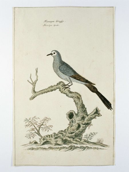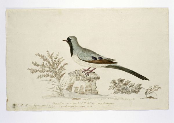 Editor: So here we have a watercolor drawing, “Tauraco corythaix,” or Knysna Turaco, created sometime between 1777 and 1786 by Robert Jacob Gordon. The colours are striking, yet something about the bird’s placement on the page feels almost… lonely? What do you see when you look at it? Curator: Lonely, eh? That resonates. Gordon was a soldier, an explorer… always observing, documenting the fauna of South Africa. Look at the detail, though! Every feather painstakingly rendered. The scientific precision reminds me of Audubon, but with a softer, more melancholy heart, don't you think? Like he’s capturing not just a bird, but a fleeting moment. Have you ever felt that urge, to hold onto something so vibrant before it disappears? Editor: Definitely. It’s like he’s not just drawing a bird, but the *idea* of the bird. Why the flat background, though? It throws me off a little. Curator: Exactly! That flatness, that lack of context…it's both a scientific observation and, I think, a reflection of his own isolation. Imagine trekking through uncharted territory, only the birds for company! He gives us the essence, distilled, the Platonic ideal of *birdness*. What do *you* make of the handwritten text below the bird? Editor: Oh right! It looks like old Dutch. It’s too faint to read, but knowing what we do about Gordon, it probably gives additional facts about the species… which actually makes its simplicity and perceived loneliness even more profound. Like, all the details are known but this bird stands on its own. Curator: Absolutely! A lovely observation. I find this piece reminds me that art can be found in the intersection of observation, documentation, and introspection. Editor: This gives me so much to think about when I visit museums. Thanks for chatting!