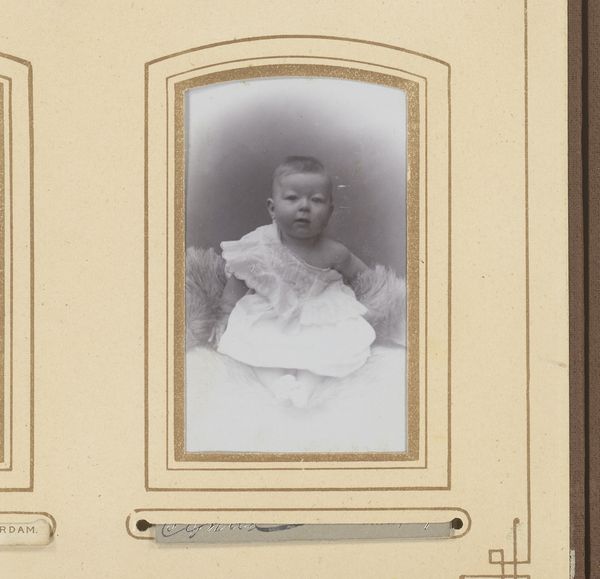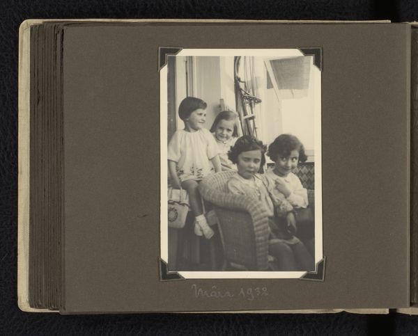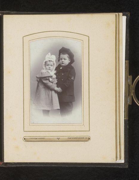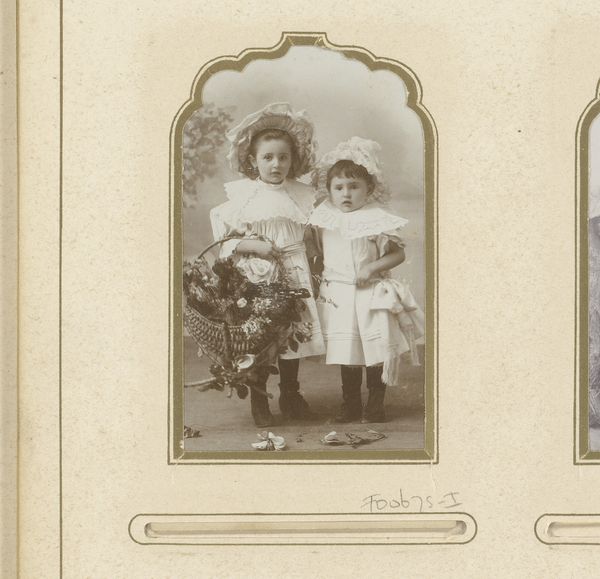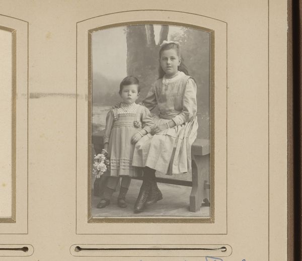 Curator: Here we see L.B.J. Serré's photographic portrait, simply titled "Portrait of Two Children", placing it somewhere between 1901 and 1960. Editor: It’s charming! And a little…haunted. Something about their eyes. They’re not looking at the camera, more like they're peering out at something we can't see. Curator: The direct gaze was less common then, I think. What’s more relevant is to consider the studio setting; a space of manufactured intimacy where subjects donned specific clothing. Notice the white dresses. Garments worn specifically for portraiture became commodities, part of the spectacle of constructing familial memory. Editor: Absolutely, it's staged, and they do look like little dolls in those frilly white dresses, perched on that elaborate chair. There is lace everywhere! Curator: And note the implicit labour involved, too. Both the actual physical work to make these clothes, or maybe even rented by the hour. In the meantime, their holding of hands is just cute; in any case it gives this a sweet tone. Editor: Right! And isn't photography magical like that? Taking these ghostly remnants of life. But looking at this makes you question what happened to these siblings: Were they friends? Did one become more successful? Where did they go and what was their impression? Curator: Those personal projections are key to photographic portraiture, yes. These details act as markers, signaling a set of period norms and photographic techniques. The way their image and status were preserved. Editor: It all makes you reflect how fragile and how lucky some children in our environment may be at a given time, which seems impossible sometimes. I do like to imagine stories with this portrait: perhaps about family struggles, but more about simple affection and care. Curator: So you feel, thinking back about production of materials like lace in clothing in that timeframe, there is more tenderness in taking these things into account for our experience. Editor: Perhaps. I am grateful I have witnessed and appreciated this old memory.