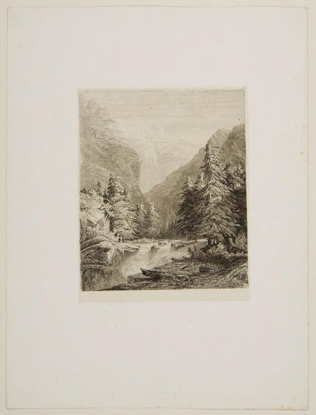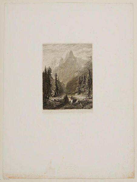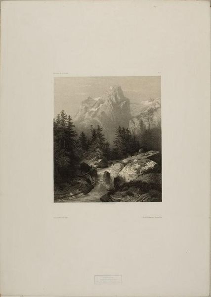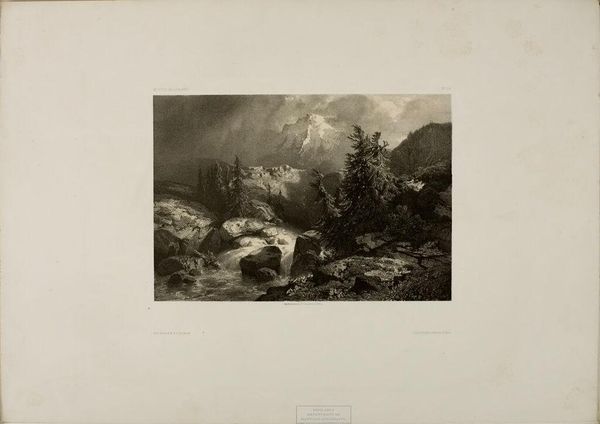 Editor: This is Alexandre Calame's "Landscape Number 77," housed here at Harvard. The monochrome palette gives it a somber, almost romantic feel. What symbols do you see at play in this work? Curator: Notice how the mountain looms, a universal symbol of aspiration and challenge, but also stability. Consider the cascading water—a sign of constant change, of time's passage, yet also of purification. Editor: So, the mountain represents permanence and the water flux? Curator: Precisely. And the forest? A space of mystery, perhaps of the subconscious. Calame masterfully intertwines these symbols. What do you make of the absence of human figures? Editor: That's interesting. It emphasizes nature's power and perhaps our small place within it. Curator: A beautiful observation. It’s through understanding these visual symbols that we can truly grasp the emotional weight of Calame's work.