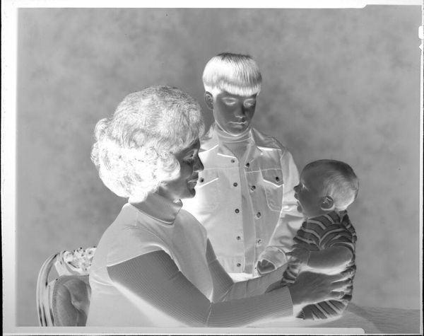 Curator: Here we have an intriguing photograph, an untitled studio portrait by Martin Schweig. It features a young man in army uniform alongside his younger sister. Editor: The first thing that strikes me is the high contrast, almost ghostly. It adds a certain weight to the image, a sense of formality and maybe a touch of melancholy, don't you think? Curator: Absolutely, the starkness emphasizes the details: the crisp uniform, her patterned dress, the weight of expectation. The composition directs our eyes right to their faces. Editor: And the artist, Schweig, has really played with light and shadow here. The highlights almost seem to erase details, giving them an ethereal quality. Curator: A beautiful observation. It definitely hints at larger themes: duty, family, and perhaps the uncertainty of wartime. I find the inverted tones rather haunting. Editor: It's a powerful image, forcing us to consider their story beyond the surface. I’m left pondering the untold narratives embedded within its luminous negative.