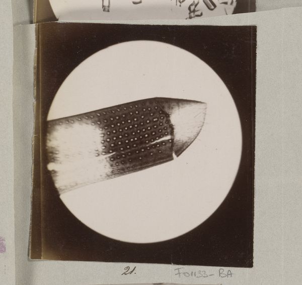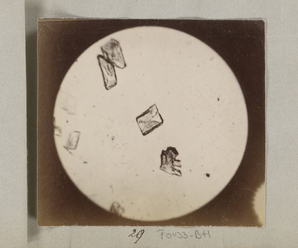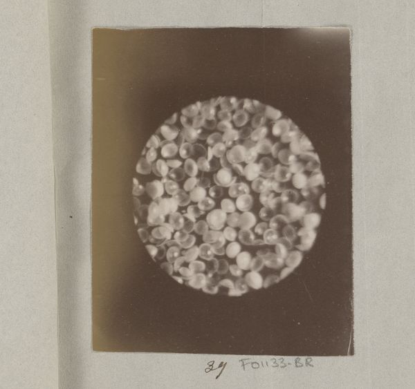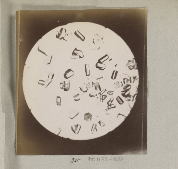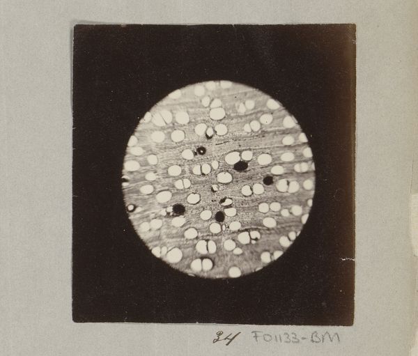 This is Marinus Pieter Filbri's microscopic photograph of mahogany, enlarged sixty times. What strikes you first is the stark contrast; a bright, textured circle set against a dark, square background. Inside, various organic shapes and cellular structures dominate. Filbri's photograph presents us with a tension between the scientific and the aesthetic. Consider the stark, almost brutal clarity with which Filbri captures the wood’s structure. The photograph makes visible what is normally concealed, revealing the complex patterns that constitute the material. The magnification destabilizes our familiar understanding, challenging our perception of scale and materiality. The image becomes a site where the boundaries between art and science blur. By framing and focusing on the patterns within mahogany, Filbri invites us to reflect on how we construct meaning through observation. What could be seen as pure data is transformed into a tableau that prompts us to question the very nature of seeing.