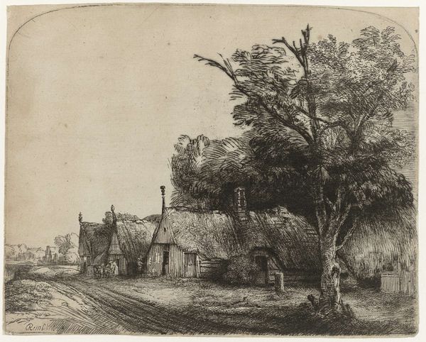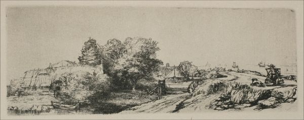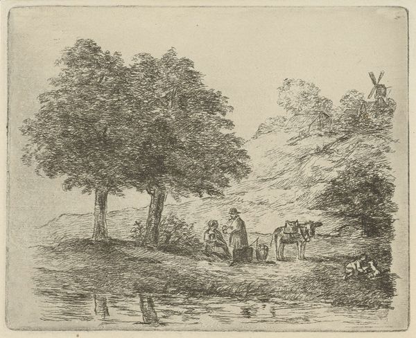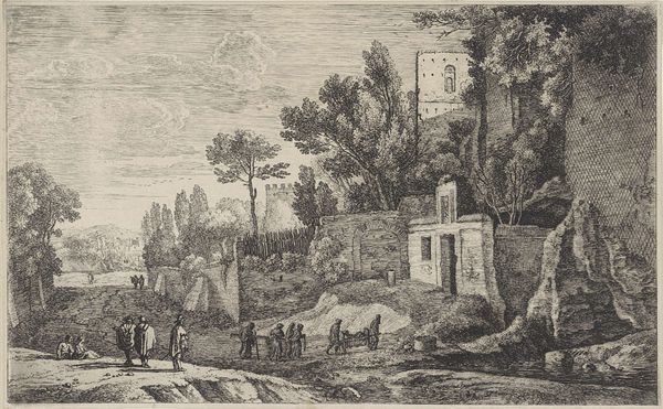 Curator: Looking at this etching, "Herd Near a Stone Bridge," I'm immediately struck by its peaceful melancholy. It feels like a memory, fading a bit at the edges. What's your initial impression? Editor: Absolutely. It evokes that very particular nostalgia for, perhaps, simpler times, conjured up with incredible detail in monochrome. There’s a certain weightiness despite its airy strokes; what can you tell me about the artist and time frame? Curator: This piece comes to us from Anthonie Waterloo. While undated, Waterloo was a Dutch artist working squarely in the Baroque tradition. And he certainly captured the idyllic beauty of rural scenes in this work! Look at the figures under the bridge – what do you make of their presence in the overall composition? Editor: Their subtle presence amplifies the sense of narrative. Are they travelers, onlookers, perhaps symbols of the passage of time itself, reflected in the water? The bridge becomes more than stone; it’s a metaphor. Curator: Precisely! Bridges often function as liminal spaces, symbols of transition and connection between separate worlds, visible and invisible. Notice how Waterloo positions the bridge—as both an arch and a rupture – between the serene water and the pastoral path? Editor: Yes, I see it, acting almost like an ancient doorway that reveals the painting's heart. I think, also, the placement of those imposing trees frames the scene to enhance this sense of enclosure. Curator: In his landscapes, the motif of cattle appears repeatedly, and are potent emblems, linking prosperity with God's blessing and harmony. Notice how that harmony is reflected through almost architectural balance with the buildings on the left and framing foliage on the right? Editor: Oh, good point about the cows. This pastoral tranquility can also imply the strength and prosperity of the community through its relationship with nature. I love how art creates its own time and reality. Curator: A wonderful point, reflecting that cultural and psychological yearning that persists across eras! What we see here is more than just cows and bridges: we're witnessing enduring symbols of humanity's connection to the land and the stories they tell. Editor: Stories we then remake in our minds, which maybe gives the image endless lives beyond its etching. Thanks!