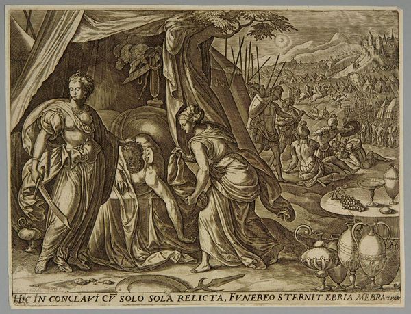 Curator: This print, currently held in the Harvard Art Museums, depicts a scene from the story of Judith and Holofernes, and is attributed to an anonymous artist. Editor: It feels like a stage set. Like everyone’s paused, holding their breath before the next act. The light is intense, almost theatrical. Curator: Yes, the image is rich in detail and likely served a didactic purpose. Prints such as these allowed biblical stories to circulate widely. Editor: All those figures! The artist really crammed them in there. Did that affect its readability, its message? Curator: In that period the visual density wasn't viewed as negative, rather it enhanced the richness of the narrative. Editor: Rich it is, but I see more chaos than clarity. Still, I admire the effort. It has a raw, unfiltered energy. Curator: I agree, and that energy probably explains some of its appeal and continued relevance. Editor: True. Art is, after all, a messy reflection of our equally messy selves.