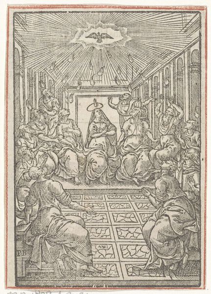 Curator: Philips Galle created this engraving, "The Descent of the Holy Ghost," in 1582. It’s an intriguing example of Italian Renaissance printmaking, currently held here at the SMK. Editor: My initial reaction is how theatrical it feels. The stark contrasts create such a dynamic scene. It’s as if a stage spotlight is illuminating Mary at the center. Curator: Right. And the medium itself—engraving—wasn’t merely reproductive; it was a critical means of distributing and interpreting artistic and religious ideas. Think about Galle’s workshop, churning out these prints for a broad market eager for imagery. Editor: Yes, the production aspect makes you consider the level of accessibility it provided at the time, far and wide! But returning to that central light, you see how the artist captures this moment of divine encounter. What must it have been like for those witnessing this event? Curator: The composition here is also carefully constructed. Notice how the dove at the top, symbolizing the Holy Spirit, radiates downwards, connecting with the figures through these sharp lines. And consider that the Italian Renaissance was intensely interested in perspective and creating believable spaces. Editor: True, there's almost a geometry to the emotion! A divine spark and also an artistic calculation to make this vision "real" and palpable. Yet those cherubic faces are very sweet. I am drawn to the expressions – the awe, the fear… such delicate renderings from the etching. Curator: Well, it really speaks to the engraver's skill in using lines to create form and texture. You get a very strong sense of three-dimensionality, even though it’s a two-dimensional image on paper. What I find significant, beyond artistic ability, is how the commercial aspect drives stylistic decisions to meet demands. Editor: Agreed! Thinking back, it feels deeply intimate, to have had a little reproduction like this and what personal connection that afforded in one's life and contemplation, no? Curator: Definitely gives you food for thought as you continue through the collection! Editor: Thanks, I feel I can now fully absorb my surroundings in our journey through the gallery.