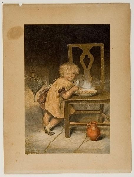 Curator: Here we have George Baxter's "I Don't Like It!", origin unknown, held at the Harvard Art Museums. Editor: Well, its sentiment is immediately clear! The face is a study in childish discontent. The whole composition feels stiff, almost stage-like. Curator: The title certainly informs our reading. It speaks to a universal experience, the struggle against the unfamiliar or unpleasant. The fallen bird may symbolize innocence lost, perhaps mirroring the child's own emotional turmoil. Editor: I’m more intrigued by the table setting—the teapot and glassware. The lines create a static tension, almost a grid, that traps the child in her displeasure. Is this a critique of domestic ritual? Curator: Perhaps. Or it could be that these are simply the props of childhood drama, the stage upon which her emotions play out. Editor: A compelling theory. This artwork, despite its seeming simplicity, does invite a deeper look at how structure and emotions interplay. Curator: Precisely. It holds a mirror to our own experiences, prompting us to consider the origins and expressions of our own dislikes.