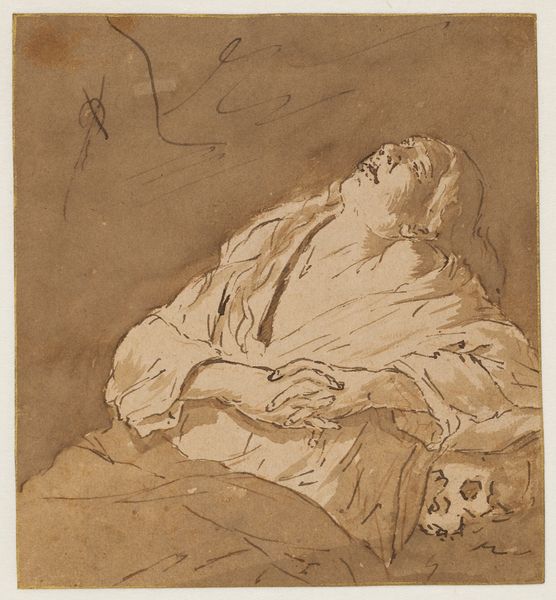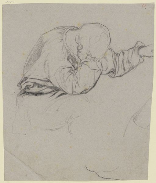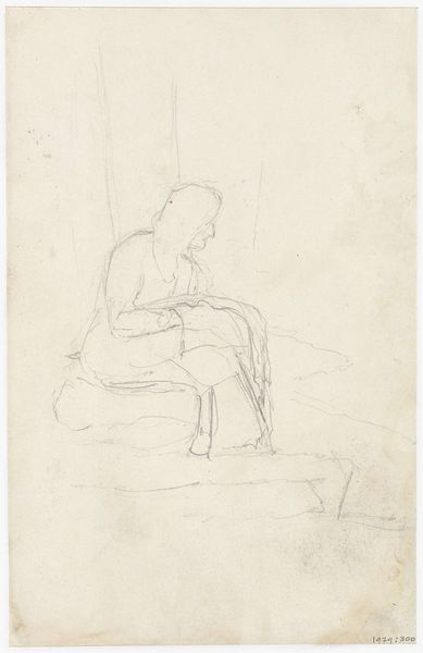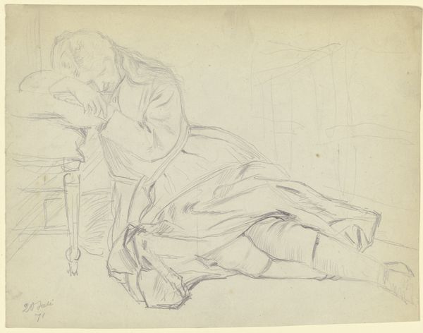 Curator: This is Otto Scholderer's pencil drawing, "Luise Scholderer sitting, with her head propped up," completed in August 1871. It resides here at the Städel Museum. Editor: Immediately, the sketch gives a feeling of melancholy, wouldn’t you say? The pose, with her face obscured... there's a weight to it. Curator: It's intimate, raw. Scholderer captures a private moment, almost voyeuristic. Notice the economy of line; he’s conveying so much with so little. Look at how the fabric drapes; he clearly understood its materiality, its weight and fall. Editor: Absolutely, you can almost feel the weight of the paper, and then of her dress—I'm intrigued by his choice to primarily render this subject matter by means of line, instead of focusing more intently on the qualities of the paper. We can also note the implications of this sketch having been developed in the moment--it privileges certain modes of spontaneous work. Curator: Do you think the ephemeral nature of the medium speaks to a particular kind of intimacy with his sitter? There's a vulnerability here, hers, certainly, but also the artist's in revealing a moment not meant for public consumption. The hand veiling her face gives it such mystery and intrigue! Editor: I agree! It really underscores how seemingly mundane objects and gestures in portraiture—the very pencil strokes—can encode social values or even intimate dramas that would be illegible otherwise. Curator: A window into a past emotion, distilled into graphite on paper. I leave it ruminating on what may be motivating such melancholic intimacy. Editor: It prompts us to reconsider our perceptions, reminding us of how the interplay between object and its representations reflects power. It has certainly changed how I will appreciate Scholderer's approach now.