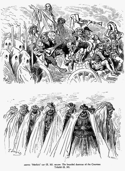 Gustave Doré created this image of Don Quixote using engraving techniques to produce stark contrasts and intricate details. The composition is divided into two scenes, each dominated by a wooden horse, one soaring through a starlit sky and the other being carried by men in a procession. The use of light and shadow creates a dramatic, almost dreamlike quality. Doré employs line and form to construct not just images but also ideas. The upper scene, with Don Quixote riding the wooden horse, uses darkness to emphasize the fantastical, while the lower scene grounds us in a more communal, earthly reality. The contrast highlights the tensions between reality and illusion, imagination and the mundane. The formal structure of this engraving serves as a metaphor for the themes in Cervantes’ novel. Notice how the graphic representation destabilizes the very notion of perspective, creating an ongoing dialogue between idealism and pragmatism.