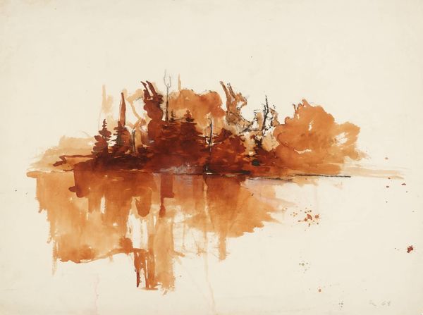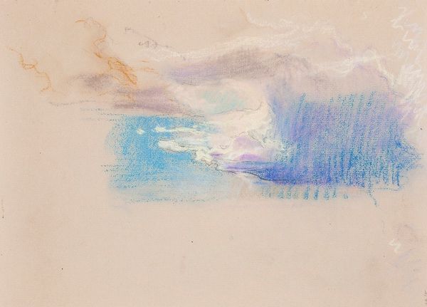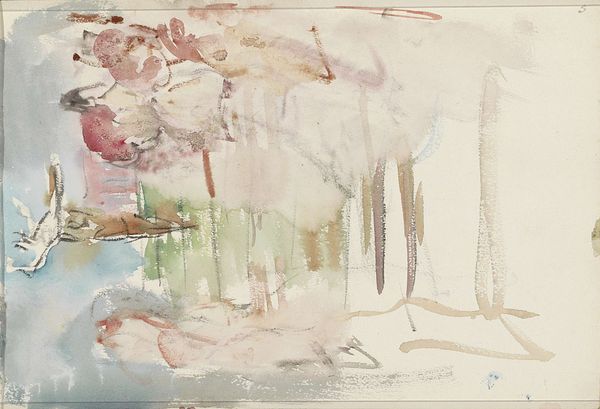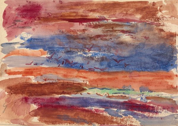 Curator: This is Hercules Brabazon Brabazon’s “Sunset (after Turner),” part of the Tate Collection. Editor: It feels incredibly transient; all fleeting washes and blurred edges. Like a memory fading. Curator: Brabazon, a late 19th century artist, positioned himself as a direct successor to Turner, consciously adopting his atmospheric style. This piece speaks to the powerful influence of artistic legacies and canons. Editor: The sunset here feels potent. The streaks of red across the sky always are symbolic of change or coming turbulence. The dark landscape below is barely defined. Is it intentional to make the viewer focus on the change in the sky? Curator: Perhaps, Brabazon found in Turner’s style a vehicle to express his own romantic sensibilities, but within a framework of established artistic prestige. It's a study in artistic identity. Editor: Interesting, this piece reveals how even something as ubiquitous as a sunset can be imbued with layers of cultural and historical meaning. Curator: Exactly.