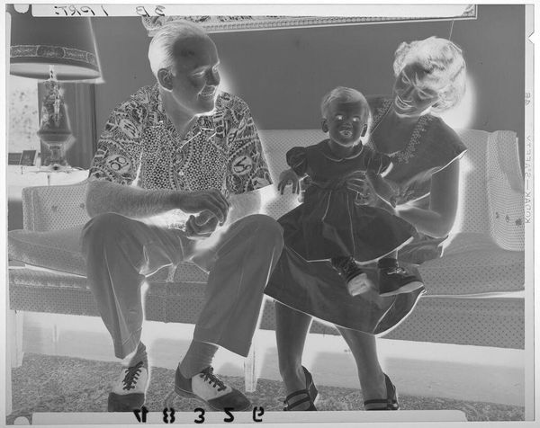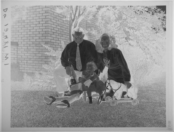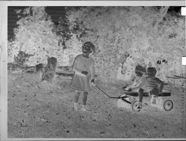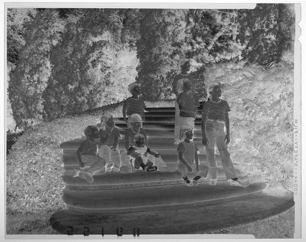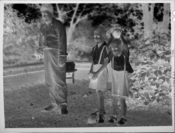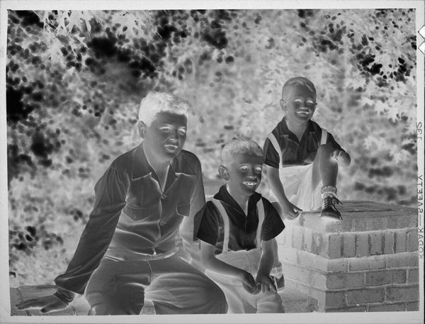 Curator: This photograph, created by Lucian and Mary Brown, shows three boys sitting on a brick wall. It's a small gelatin silver print. Editor: The inverted tones create an otherworldly feel. It makes me think about visibility and representation. Curator: Absolutely. Light and shadow are potent symbols, here perhaps reflecting the hidden aspects of childhood experience. Editor: Or, more overtly, the complex relationship of Black individuals to image-making and self-representation within a white-dominated society. Curator: Perhaps it speaks to the inherent contradictions of innocence, or the way that light and dark coexist in the human soul. Editor: It could also point to the ways in which Black joy is so often forced to exist in the shadows of systemic injustice. Curator: The image evokes a powerful, unsettling ambiguity. Editor: It’s a haunting reminder of whose stories get told, and how.