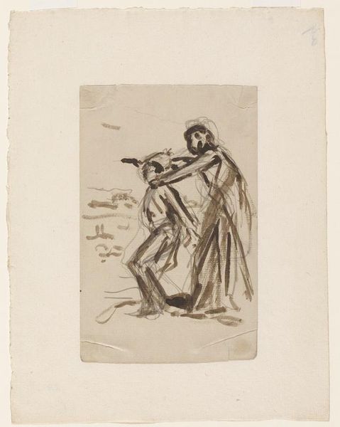 Editor: This is Jozef Israëls' pencil drawing, "Vissersmeisje, een duin aflopend," created in 1905, which translates to "Fishing Girl Descending a Dune." It has a delicate, almost ethereal quality to it. What stands out to you? Curator: I’m struck by the very *ordinariness* of the scene. Israëls, with this humble pencil and paper, elevates the everyday labor of this young woman. Note how the rough strokes create a sense of texture – the sandy dune, her worn clothing. This is not a romanticized view, but a study in materiality and lived experience. How does the use of pencil, a relatively inexpensive material, contribute to this? Editor: It does feel very grounded. I guess the pencil makes it seem more accessible, less precious, more focused on the subject's reality than on making something beautiful. It avoids, in a sense, being 'high art'. Curator: Precisely. It invites us to consider the material conditions of both the subject and the artist. Where did Israëls acquire this paper? What was the process of making pencils in 1905? Was it a local material? How would the answers to those questions affect its status as art versus documentation? Editor: So, it is not just about the girl, but about the context in which the art was produced. I am understanding more the social factors. Curator: Indeed! By focusing on the process and the materials, we are also recognizing labor not only in the image, in the girl, but also invisible labor - of the manufacturer, the person who transported material. We expand our perspective of artistic intention, production and consumption of an image. Editor: I see it in a different light now. It makes me want to research more! Curator: Excellent. And I hope you see more value, also, in less ‘precious’ work. Material considerations transform this drawing into something greater than the scene it shows.