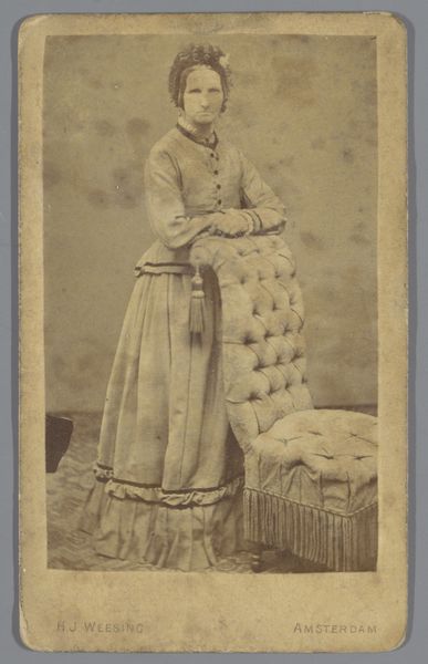 This print in the Rijksmuseum is a photograph by Andries Jager, depicting an unknown woman with a basket, in traditional costume from Zandvoort, North Holland. The composition is structured around the contrast between the woman's static pose and the dynamic patterns of her clothing. The striped skirt draws the eye downward, while the intricate details of the basket and shawl add textural complexity. Jager uses a muted color palette, which emphasizes the materiality of the fabrics and the weathered appearance of the basket. This image engages with broader questions about cultural representation and identity. It invites us to consider how traditional dress functions as a signifier of local identity and how photography can both preserve and construct these identities within a changing social landscape. By focusing on the formal elements of the photograph, we can appreciate its role in shaping perceptions of Dutch culture during this period.