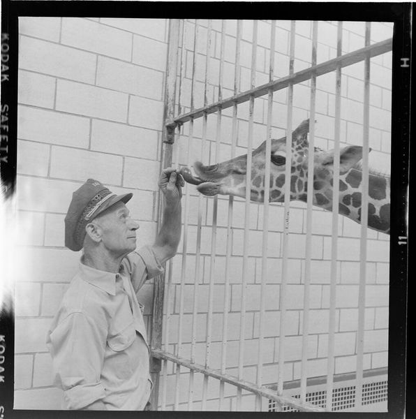 Editor: Here we have Jack Gould's "Untitled (giraffe and zookeeper)," a black and white photograph at the Harvard Art Museums. The composition, with its strong vertical lines, makes it seem quite rigid. What strikes you most about the formal qualities? Curator: Note the stark contrast between the organic curves of the giraffe and the zookeeper against the geometric grid. Consider how the tonal range contributes to the overall visual tension. Does this interplay affect your interpretation? Editor: I hadn't considered the contrast in shapes, only the lines of the cage. It seems the grid emphasizes the separation between human and animal. Curator: Precisely. The formal elements, such as the grid and the grayscale, might be interpreted as representing confinement and distance. Paying attention to those elements can enhance our comprehension. Editor: I see now how the formal qualities really shape the feeling of the piece. Thanks! Curator: Indeed, analyzing the intrinsic elements can reveal a richer understanding.