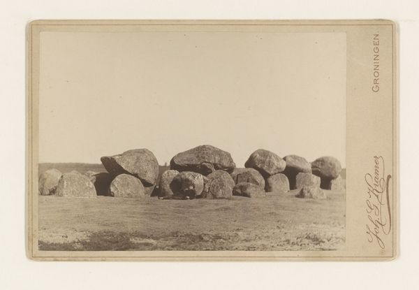 Curator: This gelatin-silver print, taken by Francis Bedford sometime between 1850 and 1880, depicts a place in Devon called the Logan Stone op Rippon Tor nabij Lustleigh. The perspective really makes it look as though we could tumble right off that precariously balanced stone. Editor: Yes! There’s such a deep and quiet strength there. The landscape feels rugged, romantic—like a stage set for some ancient tale of druids or Arthurian knights. It reminds me of Caspar David Friedrich, but with a Victorian twist. Curator: Absolutely. Bedford was active during a period when photography was being heavily utilized for documentation as much as artistic expression, though clearly his romantic sensibilities bleed through. What does this 'logan stone' even mean though? Is it a feature in the Devon landscape, something balanced just so by the hand of nature? Editor: The “logan stone” has fascinating cultural implications. Stones like this, which move when touched, have been associated with Celtic druidism and oracular practices for centuries. This photo, though seemingly just a landscape study, evokes ideas around pre-Christian, pre-colonial histories. Curator: It feels like it teeters at the intersection of history, geology and folklore. I notice there's a figure—almost incidental, like a shadow—standing near the logan stone. The image whispers rather than shouts, prompting questions more than providing answers. It reminds me a little of the observer in Edward Hopper, both there, yet curiously absent. Editor: Exactly! That solitary figure throws ideas of scale and power into relief. Here’s nature’s monument, almost like a metaphor for withstanding centuries of human and elemental disruption. How do we find ourselves positioned, both in the shadow and grandeur of it all? Who are we in relation to such power and time? Curator: I think this quiet question it poses makes this so special. The way Bedford invites the viewer into a dialogue, encouraging contemplation about the past, our connection to the land, and what it all means in the long timeline, feels profoundly… human. Editor: For me, the power here lies in this convergence—nature, myth, photography—forming a layered lens through which to see ourselves. What do we preserve, what stories do we amplify, and how do we acknowledge that which predates and exceeds us?