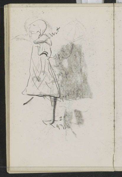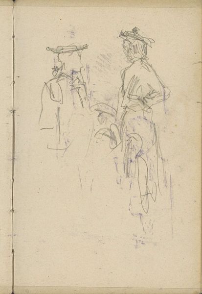 Curator: Before us, we have Otto Verhagen's "Vrouw met een parasol, man met een juk en een wandelend stel," a work from around 1928-1930, rendered with pencil and colored pencil on paper. What strikes you first about it? Editor: The feeling is transient; these figures appear sketched, capturing a fleeting moment. Are these figures observed, remembered, or conjured from the artist's imagination? The rapid strokes seem intended to capture essence rather than detail. Curator: Indeed, observe the artist's handling of line and form. Verhagen utilizes a restricted palette and abbreviated strokes to articulate volume and spatial relationships, focusing the viewer's eye on essential qualities and subtle chromatic interplay. Editor: I'm compelled to consider the social landscape implied here. The title gives us the figures’ descriptions instead of any identities. What roles might these figures occupy? Who is afforded leisure, and who bears the weight of labor? I’m intrigued by the parasol's symbolic meaning. Curator: Excellent point. The parasol acts as both a formal element creating an interesting circular form and a symbol within the broader composition. Notice, too, how the lines vary in thickness and direction to create depth and texture despite the minimalist approach. It is particularly visible when viewing the image in full. Editor: And that yoke, though barely rendered, signifies the physical burden of labor, juxtaposed against the strolling couple who embody privilege. What socioeconomic narratives are encoded in these choices? Is this work pointing to the stark class differences of its time? Curator: Regardless of one's position on the socioeconomic dimension, one has to recognize the technical prowess on display here. Verhagen successfully conveys an atmosphere with minimal mark-making; a pure expression of modern economy in style. Editor: Absolutely, its open composition allows viewers to bring their own meanings and reflections into it. For me, that incompleteness, that lingering possibility for meaning, amplifies its power. It holds within it untold narratives of gender, class, and daily experience, offering space to ponder lives and realities beyond my own. Curator: Precisely, Verhagen has, perhaps unintentionally, laid down elements that provoke thought and visual pleasure. A compelling study of modern form, with a delightful human touch.