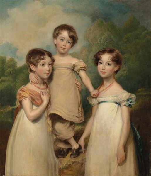 Curator: Here we have Narcisse Virgile Diaz de la Pena’s “Three Girls in a Wood,” currently residing here at the Harvard Art Museums. Editor: The figures almost glow against that deeply shadowed background. Their clothing looks rather tactile, like velvet and maybe some silk? Curator: Indeed. Diaz de la Pena was known for his landscapes, but this painting really emphasizes the figures within that landscape. There's a theatrical quality to it, a staged presentation of innocence. Editor: The focus on their garments is interesting. Who made them? What were the conditions of their production? These girls are adorned, almost presented for consumption, and those fabrics tell a story of labor and value. Curator: It's a fascinating insight. This piece invites us to consider not just the romanticism of the scene, but the socio-economic structures that frame it. Editor: Absolutely. It's not enough to simply admire the brushstrokes; we must also think about the hands, perhaps less visible, that contributed to its creation. Curator: A powerful reminder that art is always intertwined with the social fabric that produces it. Editor: Precisely. The material world, and its impact, are inseparable from the image before us.