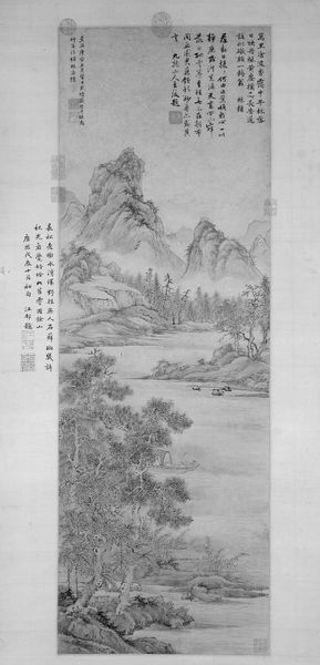 Curator: Up next, we're looking at "Noble Hermit in a Mountain Retreat," an ink drawing on paper, created by Chen Ruyan around the late 16th to early 17th century. Editor: Immediately, I'm struck by the solitude. There's a quiet strength to this image. All those sweeping lines, forming jagged mountains, convey such immensity, even a kind of peaceful isolation. Curator: Isolation is a key theme in classical landscape paintings, like this one. It often represents the retreat from the complexities of court life, the seeking of enlightenment in nature. Look at the tiny figure tucked away amidst those monumental peaks. Editor: Absolutely. The deliberate scale play highlights how humanity kind of gets swallowed up, not in a scary way, but almost like re-absorbed into something larger and indifferent to it, it allows to break up with its old patterns and be reborn as a part of a whole, one with the natural and spiritual world. Curator: Notice too how the artist utilizes negative space, or emptiness, to convey distance and atmosphere. The pale ink washes create a misty effect, obscuring details and adding to the sense of mystery. It almost invites introspection. What do you see when you gaze into that mist? Editor: I feel this pressure of expectations imposed on the human spirit during the author’s period, like this ink artwork stands against all rules that society wants you to follow, because hermit’s journey means deconstructing who you are just to become someone, one with nature and able to start over again. It has something punk. Curator: Interesting point of view! It also shows a clear departure from the artistic values of previous eras; during the Ming and Qing dynasties artists pursued not only technical skill but also the expression of emotions. Chen was good at that, don’t you think? Editor: I agree. In our contemporary world, with information constantly bombarding us, finding that space of quiet retreat becomes even more important. The noble hermit—is an icon for everyone, actually. He’s on a constant protest against imposed rules! Curator: Indeed. And Chen Ruyan invites us to contemplate it with this remarkable work. Editor: I leave this artwork now with a little bit more silence inside myself. Thank you!