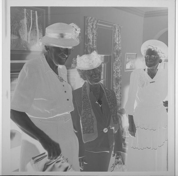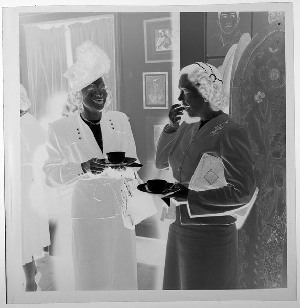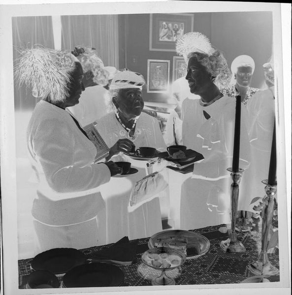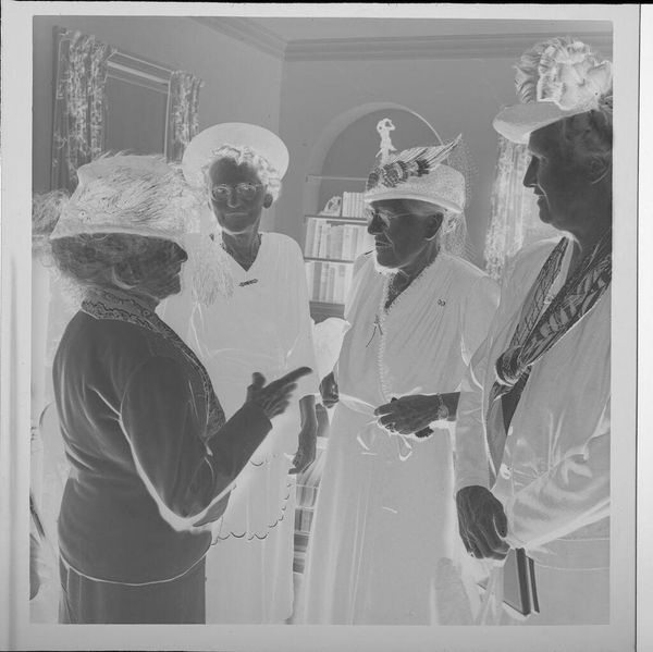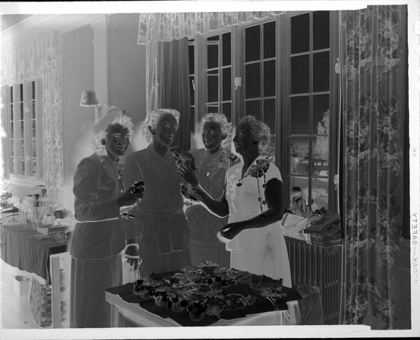 Editor: This Untitled photograph by Jack Gould shows a group of women in hats selecting desserts. It gives me a feeling of nostalgia. What strikes you as significant about this image? Curator: The hats are interesting—they are visual markers of a specific generation and their social customs. They indicate a world valuing formality. The desserts themselves become symbols of abundance and perhaps even a fleeting moment of shared joy. What do these objects tell us about belonging and identity? Editor: So, you’re saying the hats and desserts aren’t just details, but symbols of a particular culture? Curator: Exactly. They trigger a collective memory. Observing how we portray rituals around food and attire allows us to remember who we are. Editor: That's a fresh way to look at this image; I'll remember that!