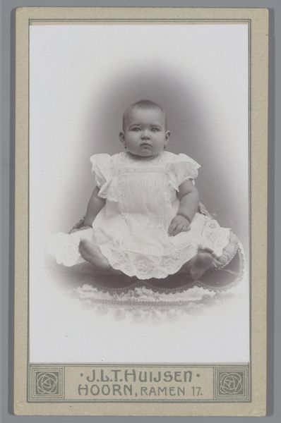 Curator: Ah, this sepia photograph captures a sense of innocent stillness. What's your first impression? Editor: Utterly charming and incredibly tactile! It’s soft, inviting...a tender moment caught in time. All the soft edges—it's dreamy. Curator: This is titled "Portret van een onbekend kind," dating circa 1915 to 1930. What do you make of the composition? Editor: The child is centered, dressed in lace, almost dissolving into the plush background, all curves and softness. It reads as very staged, a kind of constructed innocence that, to me, speaks of lost intimacy—it's touching, really. Curator: Indeed. I note how the photographer expertly employs tonal gradation. It unifies the image, lending a timeless quality to this simple photographic technique. The sepia reinforces its age, creating an aura of a bygone era, like something found tucked away in an attic. Editor: Precisely. And there's this interesting contrast between the formality of the pose and the subject's rather unruly tuft of hair! Did somebody forget the comb, I wonder? What could this mean for the photographer and how they approached portraits, back in the day? This single imperfection disrupts the polished perfection we might expect. Curator: A vital consideration. And, considering our understanding of studio practices in the early 20th century, where families routinely captured images of deceased children to immortalize memories, one is filled with sadness by this photograph, too. Editor: That darker association makes the act of preserving childhood all the more poignant here, doesn't it? Now I look at that innocent expression with a little heartbreak... Curator: The formal elements thus evoke layers of human sentiment—transience, memory, affection—an emotive interplay distilled in the delicate balance of composition. Editor: Absolutely, that little imperfect detail—that small sprout of hair—somehow holds within it such a wealth of human experience.