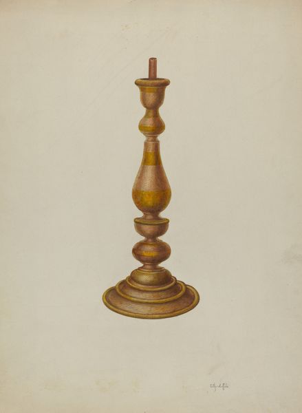 Curator: What we have here is Wellington Blewett's "Bishop Hill: Seal", a drawing and watercolor from around 1939. I am interested to hear your impression, and particularly how you see its use of materiality, before I respond in detail. Editor: Well, it's fascinating! It's so unassuming and ordinary, and I initially think of the seal as more like commercial art or a historical document. It's watercolor and drawing so delicate... How does it even fit within the scope of "art" then? Curator: An excellent question, and a critical one for understanding the piece. Rather than focusing on whether it fits some preconceived notion of art, consider the means of production here. Blewett has meticulously rendered a tool, a *seal,* used for legitimizing documents, stamping authority and control – perhaps even commercial control, in the colony. Notice the choice of materials: wood, metal, likely ink – all connected to labor, bureaucracy, and material exchange. What does that suggest to you? Editor: Hmmm... so, it is challenging the hierarchy between "fine art" and the everyday object. Is it really emphasizing that art can come from anywhere? Also the idea of labor. So it's related to what, like who makes the seal, how is it used, what sort of transactions does it perform? Curator: Precisely! Blewett invites us to reconsider the value we assign to materials, processes, and even systems of power. Consider also the Bishop Hill Colony, a utopian society. What contradictions might be present between the ideals and the means employed? Editor: I guess this isn't just some quaint picture; it's making a statement about materials and process. And it makes me think, "What other supposedly mundane things hold layers of meaning?" Curator: That is the perfect question to be asking. I wonder what we would find were we to look at, say, the history of paintbrushes.