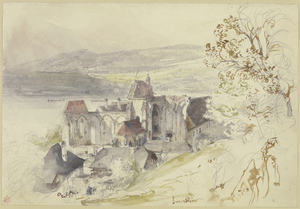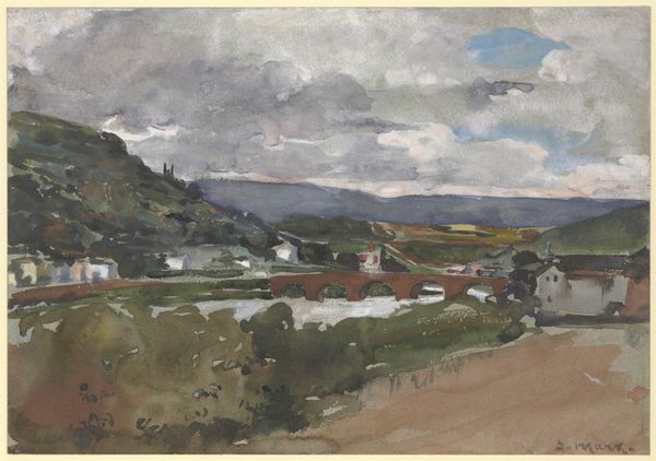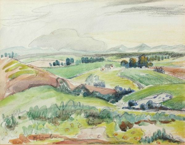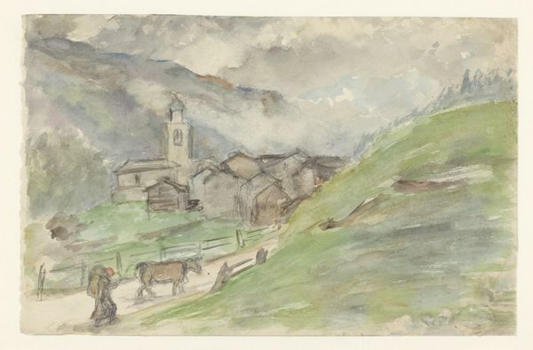Curator: Ah, the Pissarro watercolor, "La ferme à Châtillon-sur-Seine," dating from 1884. What are your initial impressions? Editor: Light. Airy. It almost dissolves before my eyes. The subtle gradations in tone, especially in the hillside, are lovely, creating a serene and idyllic rural scene. Curator: Absolutely. Note how the medium, watercolor, allows Pissarro to capture the transient effects of light and atmosphere. He employs "plein-air" techniques here; one senses his direct observation and engagement with the materiality of rural France. The production and availability of new pigment colors would have expanded his palette too. Editor: Yes, I agree. There's a definite emphasis on capturing a fleeting moment, evident in the rapid brushstrokes and unfinished quality. It feels less about solid form and more about conveying the ephemeral experience of being there. The relationship of tones establishes the relationships among all of its parts, which is harmonious to the senses. Curator: It’s interesting to consider how these landscape scenes served a consumer market increasingly detached from agricultural labor, too. The rise of urbanization changed how paintings were made and interpreted. Who do we imagine might have bought the art depicting laborers at a distance? Editor: It’s about a certain vision, the semiotics of leisure. The painting's composition—the gentle curves, the balanced distribution of elements—creates a sense of visual harmony and repose, which suggests an intended upper-class viewing experience. What is left unsaid becomes essential. Curator: The figures themselves also warrant attention. Notice the peasant woman tending to the chickens. Their forms echo those of their surroundings. He integrates the human form and activity within this environment, depicting her labour, the raising of animals for a social function, as an innate extension of rurality. Editor: Agreed, though it's also worth noting how simplified those figures are. They are there, almost gestural—it's as though Pissarro doesn't grant her too much distinct visual weight. In semiotic terms, they function primarily to enhance the rural atmosphere; in effect, to set a stage rather than star in a scene. Curator: Ultimately, the value of his approach in this 1884 artwork comes from its emphasis on lived experience; capturing the social climate; and representing agricultural subjects with Impressionistic sensibilities. Editor: And formally, it is that fleeting glimpse and visual concord. He uses watercolours with the formal devices of the tonal scales. Both, really, leave me reflecting on the artist's vision as revealed by technique and time.