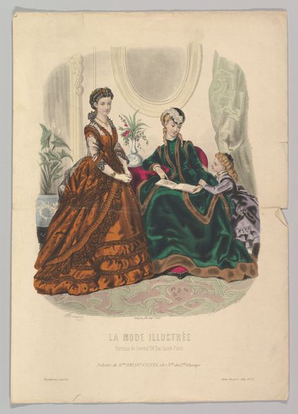 Héloïse Leloir created this print, Number 473 from La Elegancia Barcelona, using lithography. The composition is built on the interplay of light and shadow, emphasizing the texture and form of the luxurious dresses. The artist directs our gaze through delicate lines and color contrasts, evoking a sense of refined elegance. In this print, the signifiers of bourgeois identity are meticulously rendered. From the elaborate folds of the dresses to the subtle gradations of color, Leloir uses detail to construct a world of aristocratic leisure. These visual elements function as codes, signaling social status and cultural capital. The use of lithography allows for a precise reproduction of textures and patterns, enhancing the visual impact of the garments. The image challenges the notion of fashion as merely superficial. It presents it as a complex language through which individuals negotiate their place in society. The structure of the artwork—its composition, detail, and technique—serves as a cultural mirror, reflecting and shaping perceptions of elegance and social standing. This is not just about clothing; it is about constructing identity.