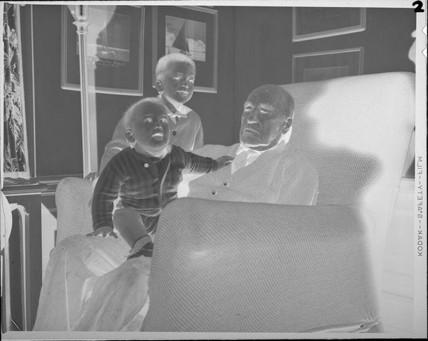 Curator: This photograph by Jack Gould, currently titled "Untitled (woman standing with two elderly people in rocking chairs)" presents an intimate domestic scene. I'm struck by the composition; it's almost staged, yet feels utterly genuine. Editor: The inverted tones create a stark, otherworldly feel. Look at the textures—the wallpaper, the curtains, the woven rug. It speaks of a specific time, place, and class. Curator: Absolutely. The means of production—a simple camera, film—belies the complexity of the social dynamics captured. We see labor made visible in the act of care the younger woman provides for the elders. Editor: But note the formal arrangement of the figures. The standing woman acts as a visual bridge, connecting the seated figures in a triangular composition. It gives the image a certain stability, despite the tonal inversions. Curator: The image hints at the social conditions that shape lives and caretaking roles within the family unit. It is not simply a composition, but a document of labor and material conditions. Editor: I find myself drawn to the geometry, the light falling through the curtains, the way the shapes repeat throughout, inviting a sense of introspection about the photograph’s narrative. Curator: It highlights how our social positions influence even the most intimate moments. Editor: Yes, and how formal choices affect that experience.