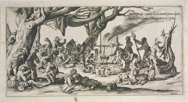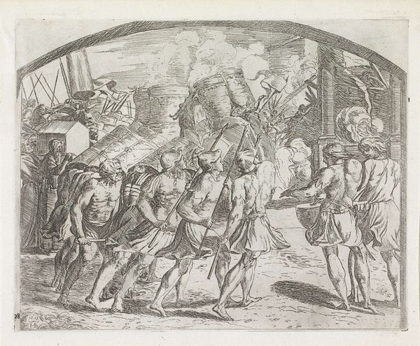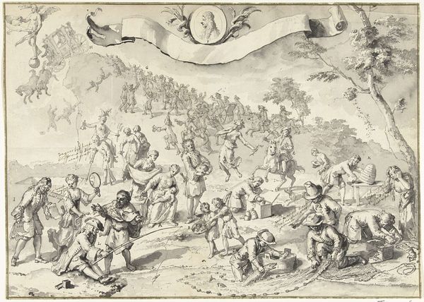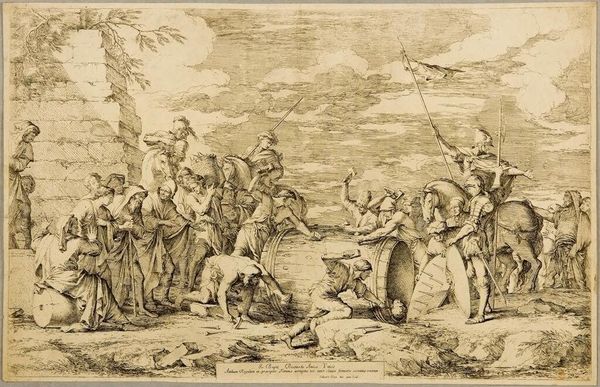Editor: This is Melchior Küsel's "Triumph Scene," an engraving. The sheer density of figures gives it an overwhelming feel. What kind of narrative or symbolism do you see at play here? Curator: The triumph, a powerful visual trope throughout history, is here rendered with meticulous detail. Consider the horses, symbols of power and conquest, or the central figure elevated on a highly decorated chariot. What memories do such images evoke, and what cultural continuity do they suggest? Editor: The idea of cultural memory really resonates. It’s like the artist is tapping into a long history of triumphant imagery. Curator: Precisely. And how does understanding that lineage change your perception of the piece? Editor: It makes me think about how power is constructed and visualized across different eras. Thanks! Curator: Indeed. The symbols persist, but their meanings evolve. Something to consider moving forward!