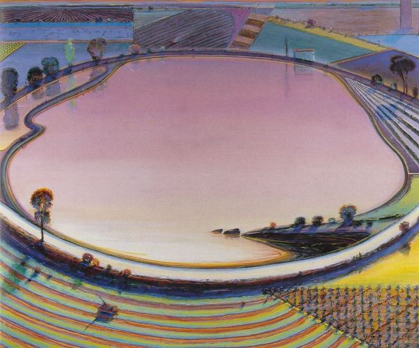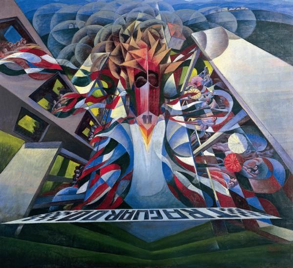 Here is a painting by Gerardo Dottori, titled “Primavera Umbria.” The entire composition seems to bend and curve, inviting us into the pictorial space through the dynamism of its lines. The artist uses a wide-angle perspective, almost as if viewed through a fish-eye lens, to distort the landscape into a vortex of color and form. The artist uses bright greens and blues to create an illusion of depth, with bands of color overlapping in a circular configuration. This is achieved through distinct brushstrokes and contrasting shades, which emphasizes the undulating rhythm of the countryside. The overall effect is a harmonic symphony of natural and geometric shapes. The painting, therefore, functions as a window into a world that is both familiar and strange. It challenges us to reconsider our relationship with the world, and the structures through which we view it.