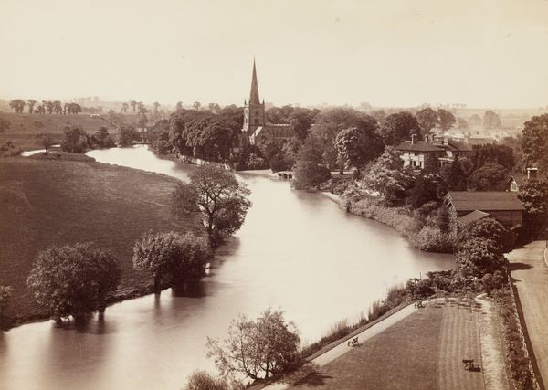 Editor: Here we have Francis Bedford's photograph, "Stratford-on-Avon Church, from the Avon," taken in the 1870s. The sepia tones create such a still, reflective atmosphere. What sociopolitical meanings might this idyllic image be trying to convey? Curator: This image, made during the height of the British Empire, invites us to consider how notions of national identity and cultural heritage were constructed and disseminated through photography. Notice the prominence of the church. What does that signify about the values being projected? Editor: It seems to be about promoting a specific image of England - one of peace, tradition, and the established Church, almost deliberately avoiding anything remotely industrial. It’s like a visual counter-narrative to the realities of the Industrial Revolution. Curator: Exactly. Think about who had access to such imagery at the time, and what power dynamics were at play. Was this vision accessible and shared by all or was it intended to soothe the anxieties of the elite during a time of rapid social and political change? And what of the working class, the colonized? Editor: So, this photograph is not just a pretty landscape, but a carefully constructed statement. A reminder that even seemingly benign images can carry powerful ideologies. Curator: Precisely. Seeing the artwork in this sociopolitical frame can radically alter our understanding of its original, intended meaning. It encourages us to see beyond the surface, to ask difficult questions. Editor: I see. This makes me think about the role art plays today, and whose voices are represented or excluded. Curator: Yes. Art history must engage with current debates, connecting past and present. Considering these aspects really brings new layers of meaning to what I initially saw as just a peaceful scene.