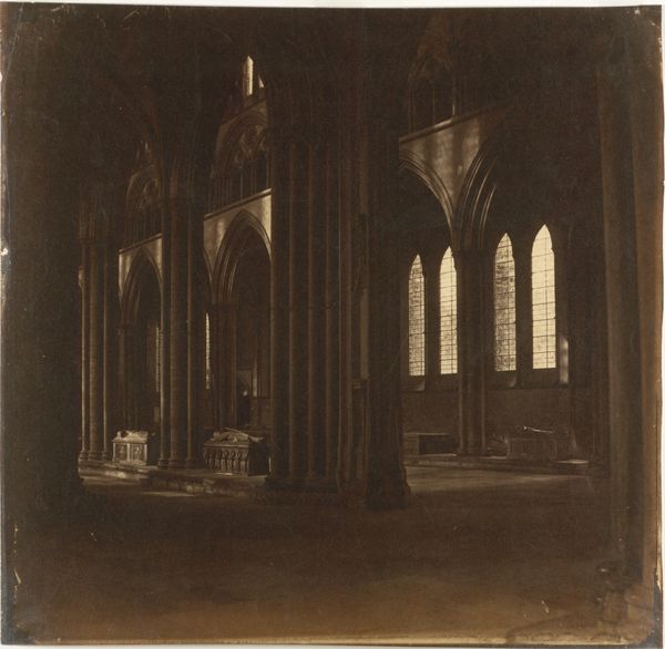 Alfred Capel Cure created this photograph titled 'Interior, Tintern' using the albumen silver print method. The sepia tones and the soft focus evoke a sense of nostalgia and decay, inviting contemplation on time and memory. Notice how the composition is structured around the vertical lines of the Gothic columns and the ornate window. The strong verticality contrasts with the organic forms of nature reclaiming the architectural space. The light filtering through the window creates a focal point. This interplay between light and shadow enhances the texture of the stone and vegetation, adding depth to the image. The photograph challenges fixed meanings, engaging with Romantic ideas about the sublime and the picturesque. Cure uses the semiotic system of architectural ruins to signify the transience of human endeavor against the timelessness of nature. The ruin doesn’t just represent a physical space; it becomes a symbol of emotional and spiritual reflection. The photograph functions aesthetically and as a cultural artifact of the Victorian era's fascination with ruins and the passage of time.