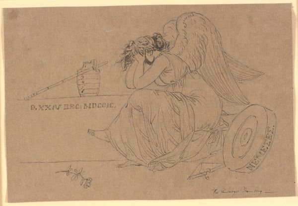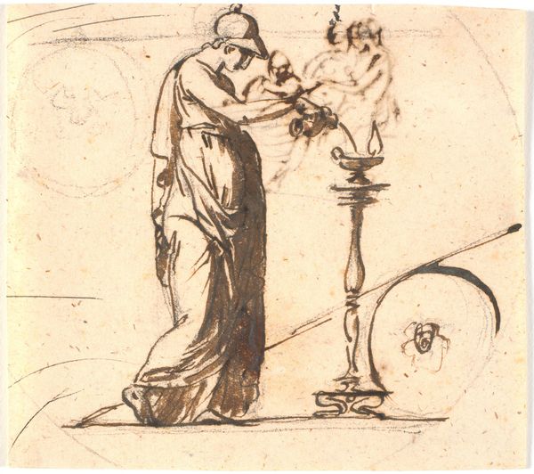 Editor: This ink drawing, made around 1799 by Nicolai Abildgaard, is titled "Nemesis Covers her Eyes in Grief. Allegory on P.A. Heiberg's Banishment". It has such a mournful, dejected mood. What sociopolitical contexts influenced this work? Curator: It's fascinating how Abildgaard uses the figure of Nemesis, the Greek goddess of retribution, to comment on the banishment of the writer P.A. Heiberg. We see her grief, but consider: What does it mean for justice itself to be in mourning? Is it just for Heiberg to be banished? Editor: I guess her sorrow could imply that Heiberg's banishment was an injustice, not a justified punishment. Curator: Exactly. Think about the power dynamics at play. Heiberg, a satirist, challenged the Danish monarchy and social norms. Abildgaard, through allegory, subtly critiques the King's decision. The seemingly classical style is actually charged with political meaning. What about the objects surrounding Nemesis—the vessel and broken wheel? How do those tie into this commentary? Editor: Perhaps the broken wheel—a wheel of fortune maybe?—represents Heiberg’s ruined fate. And the vessel represents writings destroyed after banishment. Curator: Precisely. By personifying justice as grieving, Abildgaard uses the language of Romanticism to deliver a sharp, political statement, speaking to the power of art as social critique. Do you think that this type of work might be produced today? If so, what and who could they address? Editor: Definitely. This piece makes me think about contemporary artists using their work to protest social injustice, to be a voice for those in need, to be brave enough to confront difficult issues in creative ways, to show alternative, often repressed viewpoints. It all connects, really. I never would have considered allegory could be a form of activism, though! Curator: The drawing illuminates how artists have historically navigated censorship and power. By understanding these historical strategies, we can be more astute interpreters of art today.