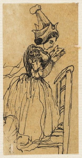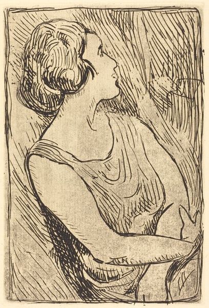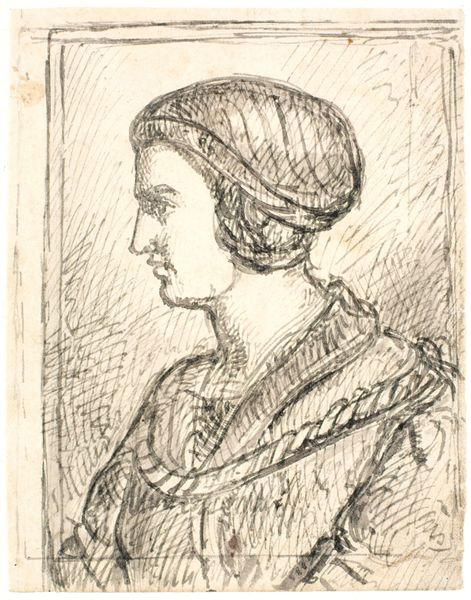 Editor: This is Rodolphe Bresdin's "Bust of a Woman with a Floral Headdress". It's quite small, just a few centimeters, and appears to be an etching. I'm struck by the contrast between the delicate details of the face and the almost chaotic lines of the dress. What can you tell me about this work? Curator: Let's consider Bresdin's process. The intricate linework, likely achieved through etching, points to a time-consuming and skilled labor. How does the scale—its smallness—affect your perception of its value and the labor involved? Editor: That's interesting! I hadn't thought about it in terms of labor. Knowing it's an etching makes me appreciate the work that went into it, despite its size. Curator: Exactly. And what about the social context? Bresdin worked outside the mainstream art world. Did his position affect his choice of materials or the subjects he depicted? Editor: I hadn't considered that either. It does make me wonder if he chose etching because it was more accessible, or if the subject matter relates to his social circle somehow. Curator: Precisely. Examining the means of production offers insights beyond the purely aesthetic. Editor: I'll definitely look at art differently now, considering the "how" and "why" behind its creation.