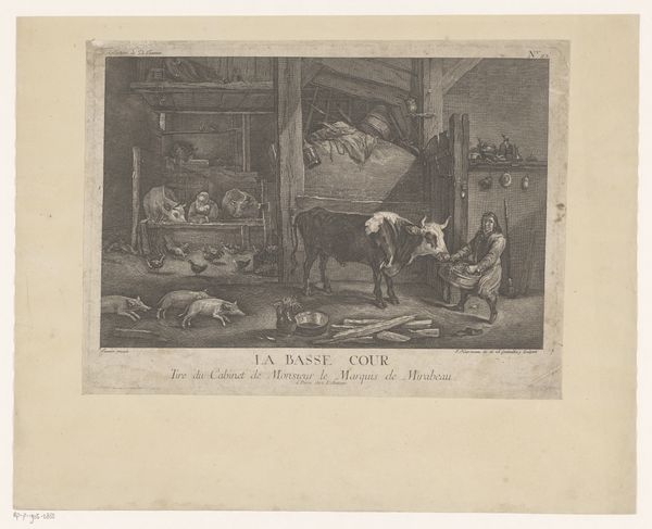 Curator: This is Plate V, one of the series "Marriage A-la-Mode" created as an engraving by William Hogarth around 1745. It's currently part of the collection at the Minneapolis Institute of Art. Editor: Oh my, what a bleak scene! A dramatic climax. It’s claustrophobic and heavy, full of secrets lurking in the shadows. I’m instantly pulled in by the high drama. Curator: Indeed. Formally speaking, we can examine Hogarth's use of line, here extremely precise and economical, which generates a strong sense of both realism and theatricality. Note the arrangement of figures – the spatial organization suggests deep disharmony, reflecting the emotional content. Editor: The tilted candle on the table…almost as if the scene itself is off-kilter. I feel her desperation as she pleads—is that her husband leaning with his chest pierced?! You almost miss him and the guards bursting in on the left, there's just so much to take in. I bet he's visiting her lover again. I can almost hear the squawking! Curator: His slumped posture absolutely speaks of collapse—physical, moral. And, yes, those emerging from the doorway provide an essential counterpoint in the narrative. Think how Hogarth layers gazes and actions to convey narrative— a signature of Baroque history paintings like this one. The composition is far from arbitrary. Editor: But who knew genre scenes could have so much bite? Looking closer, the tiny cherubs defacing the painting above her just twists the knife, doesn't it? Hogarth masterfully hints at how far this marriage has descended from love and cherubs! Curator: Certainly. It functions as a visual commentary and illustrates moral and social failings with such precision. Through composition and fine detail, Hogarth compels you to consider 18th century mores on class, marriage, and virtue. Editor: Hogarth, you savage. All those perfect baroque curls barely hide such darkness. Makes me question those times as well as these! Well I guess sometimes beauty hides corruption and brokenness pretty darn well. Curator: I concur, he truly masters the art of societal critique. Let us proceed to consider how he may be the first tabloid artist.