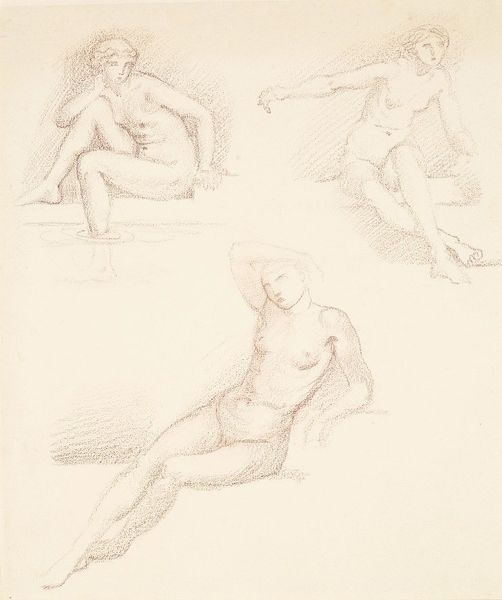 Edward Burne-Jones created this drawing titled "Female Nude – Five Studies" using a red chalk. Notice how the composition is organized around five distinct poses of the female form, each rendered with delicate lines and subtle shading. The poses explore different aspects of the human form, from the seated figure to the reclining one, capturing the interplay of light and shadow across the body. Burne-Jones's strategic use of line weight and hatching creates a sense of depth and volume, while the limited color palette emphasizes the purity of form and the artist's skillful handling of the medium. The arrangement of the figures across the paper creates a dynamic visual rhythm, drawing the eye from one pose to the next. Burne-Jones's classical influences are evident in the idealized proportions and graceful contours of the figures. Through these formal elements, the artwork invites us to contemplate the beauty and complexity of the human body.