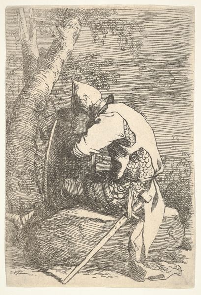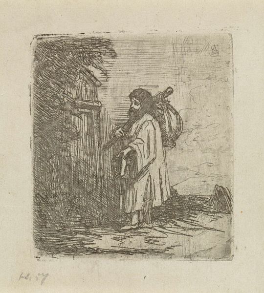 Editor: This ink and print drawing, “Illustration til "Venskabs-Pagten" i H.C. Andersen, "Eventyr og Historier", Bind 1,” was created by H.P. Hansen between 1870 and 1873. It’s a fairly simple sketch, seemingly illustrating a narrative moment. What catches your eye in this work? Curator: What strikes me is how the printmaking process makes readily available the reproduction of illustration. These readily made images enter a sphere of consumption that is far more ubiquitous than unique artworks. How do you feel this ready-made accessibility affects our reading of it today? Editor: That’s a great point! I hadn’t considered how mass production impacts its cultural relevance now. Does the subject matter of the illustration—figures, landscape, narrative—play a role in its status as a commodity? Curator: Absolutely. Hansen’s illustration is embedded within the framework of Andersen's fairy tales. This means its value isn't solely artistic. Consider how the story informs the material image, adding value for its consumers. How does that interplay between narrative and illustration then feed into its cultural endurance, if at all? Editor: So the enduring appeal of the fairytale makes the image continually relevant? It sounds like there's a connection between artistic creation and consumption, with fairytales adding another layer of cultural meaning to the production. Curator: Exactly. It shifts our focus from aesthetics to function within the system of book production, readership and enduring stories. Editor: That makes me appreciate the piece more. Seeing art as a product shaped by production changes my perception of its role and value. Thanks for broadening my perspective. Curator: Indeed. Examining art through the lens of its production reveals fascinating connections between culture and consumerism.