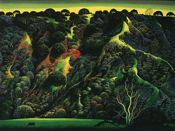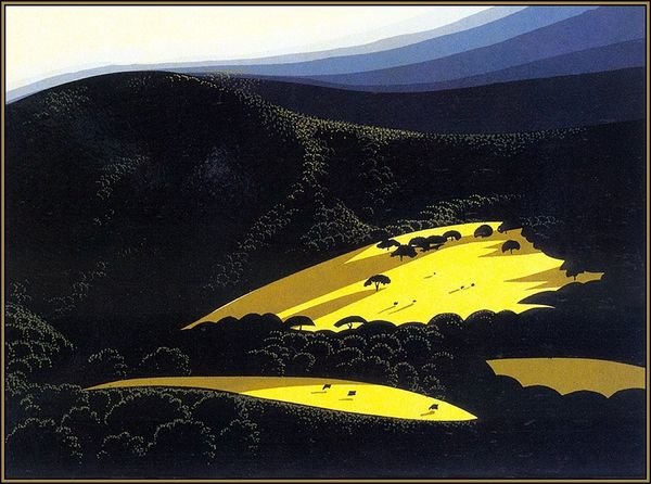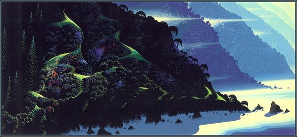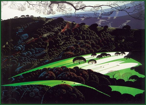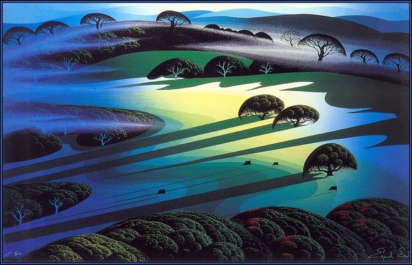 Curator: Oh, there’s such a feeling of hushed reverence in this one… it makes me want to tiptoe through the gallery! Editor: It's Eyvind Earle's "Fog and Storm and Rain," painted in 1996. Acrylic on, I presume, prepared board given the hard edges. Quite a statement in the mid-90s when so many were turning to digital techniques. Curator: You know, those clean lines and that almost airbrushed look lend it a sense of dreamscape…like a half-remembered childhood place where all the trees are perfect broccoli florets! There’s something sweetly unsettling about it. Editor: The materiality is fascinating; look at how each tree is regimented, produced as modules that build into a larger ecosystem. Very labor-intensive to achieve this degree of precision and suggests industrial models applied to a natural subject. Curator: Absolutely. But also… aren’t landscapes always *ideals*? We never quite find them as pristine as we hope, so this resonates with that yearning for impossible perfection. I am also completely transported by that swatch of sudden sunshine slicing through… Editor: The yellow, yes—an artificial light source amidst a supposedly natural vista. What resources and processes went into creating such an intensely pigmented surface? Consider also how the application of light affects perceived value, framing the central field like a stage. Curator: And does anything actually happen on that stage? We expect some grand event to play out under that spotlight, but maybe that's part of Earle's humor... Or perhaps the loneliness of the open green spot echoes the potential inherent in landscapes—promising adventures, but often falling short. Editor: So the experience becomes about unrealized expectations? I am mostly just struck by the environmental impact involved, not only with painting this, but with seeing the manufactured landscape as resource exploitation, given his heavy dependence on certain mined and refined material outputs to even do something like this, like titanium for that striking white. Curator: Yes, that is there, but ultimately, despite all the critical dissection, isn’t there also simply something peaceful about it? The perfect calm before the…well, before the fog and storm and rain arrive! I think I love his idealized, yet strangely accessible view of the landscape and nature's forms... Editor: I see it a bit differently—a statement about manufacturing desire within landscapes as sites of consumption—rather than passive appreciation, maybe it reveals the dark ecological footprints embedded in our romantic vision of Nature.