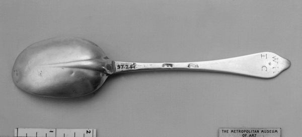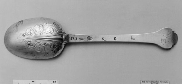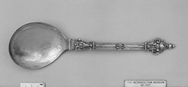 Editor: Here we have what's called a "Fruitlet Spoon", dating back to between 1600 and 1650. It is currently held at the Metropolitan Museum of Art. It’s crafted from silver. Looking at this image, it gives me a real sense of ornate delicacy. The engraving is mesmerizing. What captures your imagination about this particular spoon? Curator: Oh, it’s like gazing into a time capsule, isn't it? This spoon, humble as it seems, speaks volumes of a bygone era, an era of candlelight dinners and whispered secrets. It’s not just the Baroque flourish – the swirls, the finial shaped like a tiny, precious artichoke – but the intimacy it implies. It whispers, doesn't it, of personal rituals, of carefully measured portions, perhaps of medicine rather than merriment? And, I wonder, who held it last? Whose lips did it grace? Perhaps some somber faced gentleman or woman about town, being made to eat against their own better desires? Does the engraving reveal a story, maybe a hidden family motto? Editor: So it’s less about the grand statement of, say, a Baroque painting and more about the subtle stories woven into everyday objects? Curator: Precisely! These decorative objects were often profoundly personal, reflective of individual stories and private spaces, acting like subtle whispers against the rather louder pronouncements of paintings or architecture. This piece speaks of hidden identities in public spaces, existing in an age of intrigue and mystery. Editor: That really changes how I see it. I was initially focused on the craftsmanship, but now I see it as a tiny stage for a forgotten drama. Curator: And isn’t that the magic of art? It invites us to become detectives, peering into the past through the lens of our present. We both took so much from this little objet today, didn't we? Editor: Absolutely, it is indeed something new and exciting to think about and examine when moving about our day-to-day.