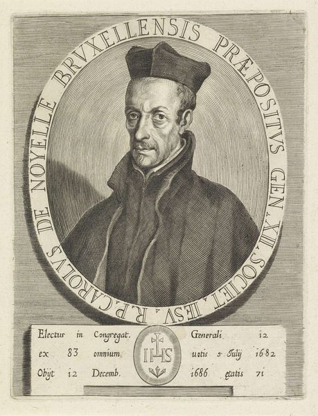 Giovanni Antonio Faldoni created this print, "Portret van geestelijke Luigi Centurione," around the mid-18th century. The composition is dominated by the oval frame, tightly enclosing the subject and an inscription. This immediately establishes a sense of confinement, contrasting with the potential for open space in portraiture. Faldoni's use of line is meticulous, almost taxonomic. He meticulously renders Centurione's features and garb. There’s a deliberate flattening of perspective, drawing attention to the surface and the graphic quality of the image. The use of monochrome further emphasizes the structural elements, reducing the image to its essential forms. The circular text surrounding the portrait serves less as descriptive information and more as a structural component, reinforcing the enclosure. This, paired with the minimal tonal range, creates a feeling of austerity. Ultimately, the print is a study in the interplay between confinement and the human form, inviting us to consider the constraints of representation itself.