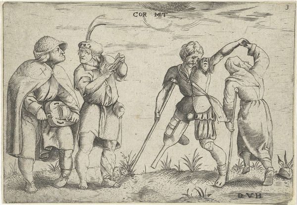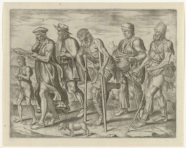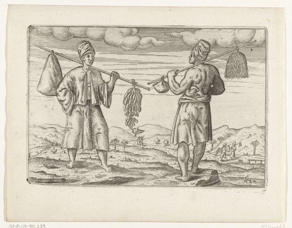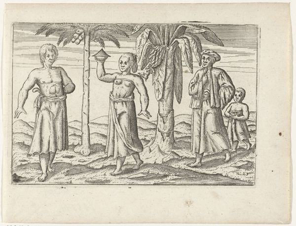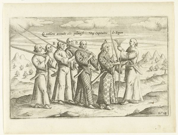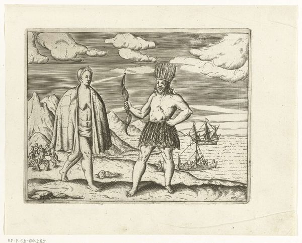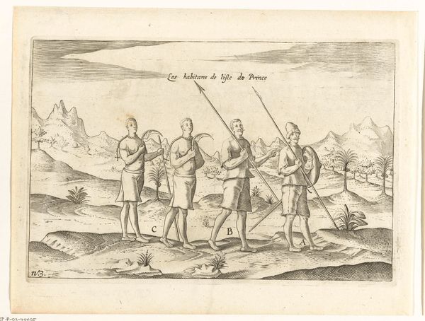 This is an engraving from 1596, of unknown authorship, representing three warriors from Bantam. The composition is strikingly organized around three main figures contrasted with the more diminutive stature of the background characters. The foregrounded warriors are depicted with a high level of detail in their attire and weaponry. Structurally, the print employs a contrast between the detailed depiction of the figures and the somewhat sparse rendering of the landscape, challenging a classical approach to perspective. The linear quality of the engraving emphasizes form and contour over tonal modulation, creating a stylized effect. The visual codes at play are intriguing, the detailed rendering of the warriors’ equipment may reflect a European fascination with exotic weaponry, while the somewhat flattened perspective destabilizes a singular viewpoint, inviting multiple interpretations. This artwork underscores how cultural encounters are mediated through specific visual languages.