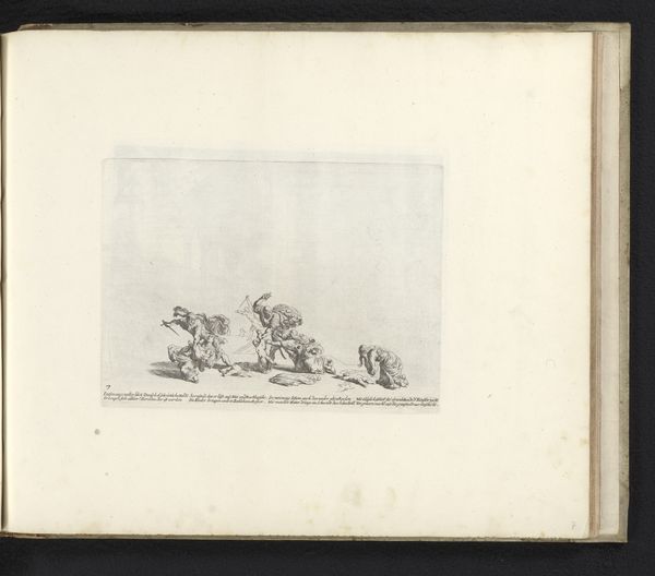 This anonymous etching titled "Poleti i Borgergaden 1798", captures a stark scene with precise lines on a small scale. The composition, dominated by a rearing horse and figures in mid-action, evokes a sense of disruption within the structured environment of the street. The artist’s use of line is particularly striking. It not only defines form but also conveys movement and tension. The cobblestone street, the rigid architecture, and the chaotic interplay between humans, animals, and space all contribute to the artwork's dynamic. We can consider how the artist's choice of this medium influences our perception. The etching technique allows for a clarity that renders the scene with a sense of immediacy, while the linear detail invites a deeper reading into the social dynamics. Ultimately, the rigid structure of the architectural forms is juxtaposed against the violent scene. This creates tension, and perhaps aims to destabilize our understanding of order and control in the urban environment. Art is never truly resolved. It remains open to interpretation and questioning.